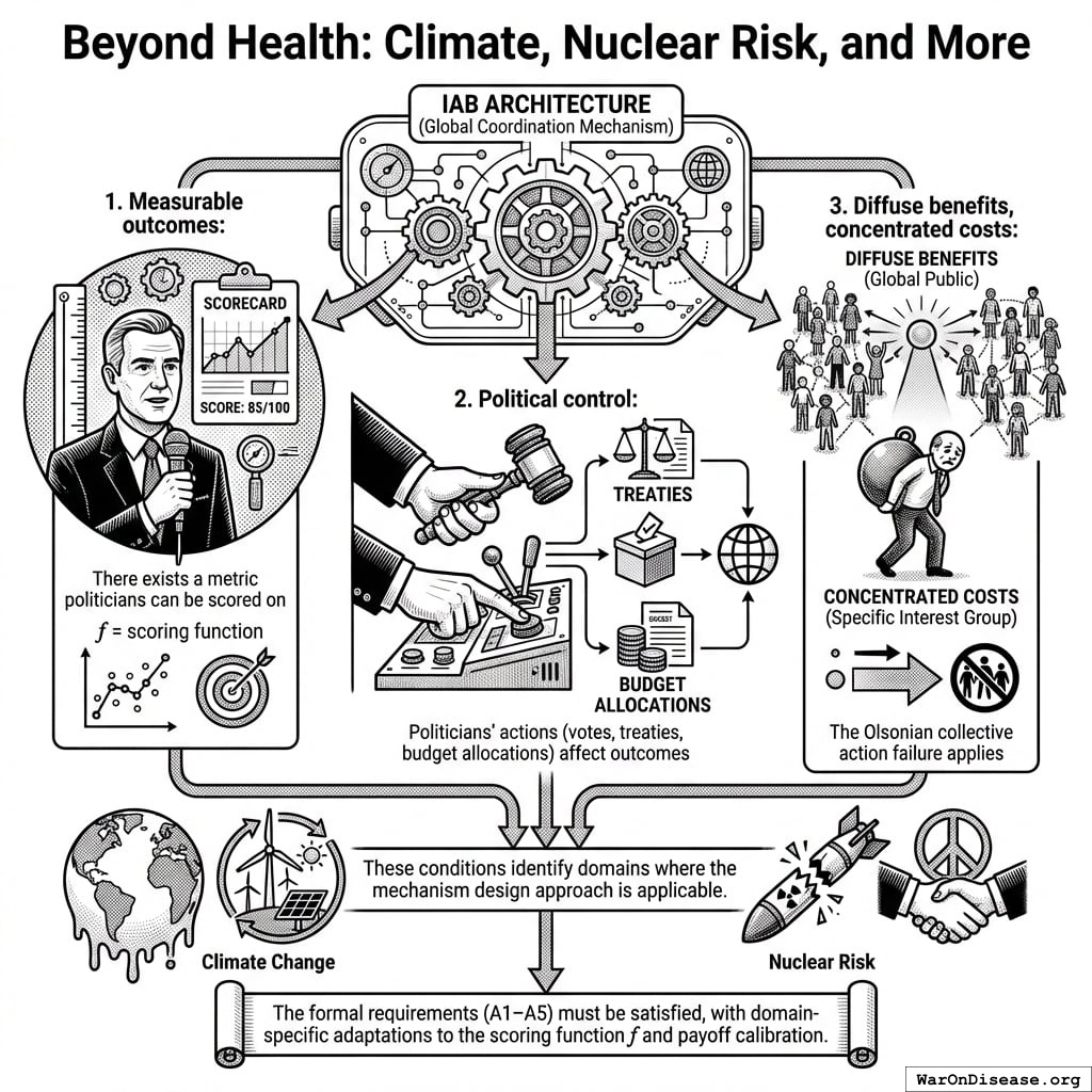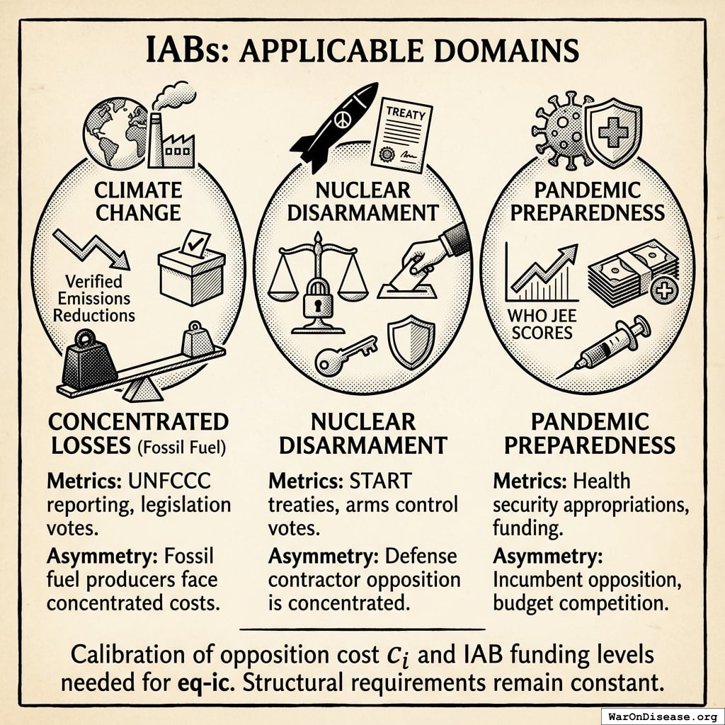 These estimates are illustrative and require empirical calibration. The general pattern suggests that domains with lower concentrated opposition (pandemic preparedness, health research) require lower IAB funding to achieve incentive compatibility, while domains with entrenched industrial opposition (climate, defense) require larger investments.