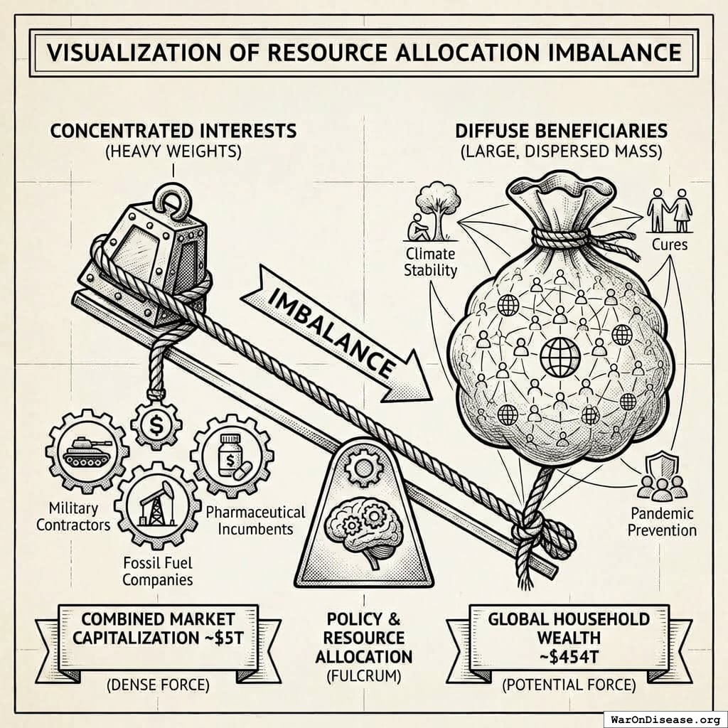 - $454T vs. $5T capital asymmetry ensures diffuse beneficiaries (citizens who’d benefit from cures) can outspend concentrated opposition (military contractors) by 90:1 (Section 2.3)
