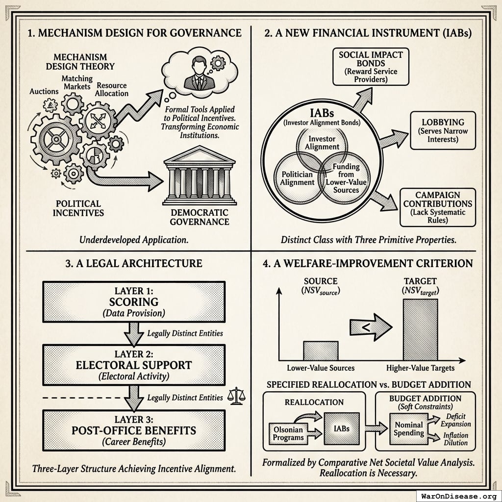 This paper introduces Incentive Alignment Bonds (IABs), a mechanism design approach to reversing this dynamic. Rather than attempting to change politicians’ preferences or relying on benevolent decision-makers, IABs restructure the incentive environment so that rational self-interest points toward welfare-improving policies.