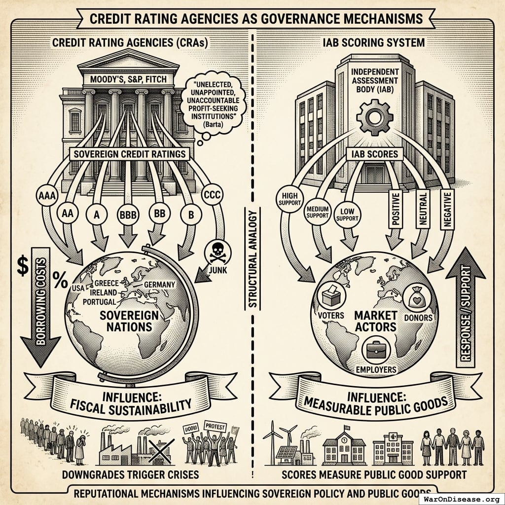 Calibration notes. Pharmaceutical industry lobbying exceeds $300M annually. However, pandemic preparedness funding faces less concentrated opposition than military or fossil fuels, suggesting lower IAB funding thresholds may achieve incentive compatibility.