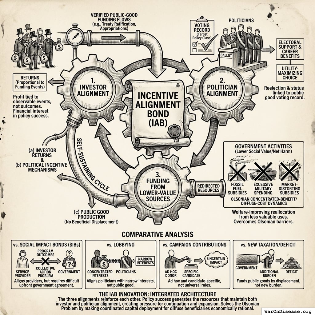 Government spending correlates with lobbying intensity, not marginal societal value. Programs with benefit-cost ratios exceeding 100:1 (vaccines, e-governance) receive single-digit billions while programs with negative net returns (military beyond deterrence, fossil fuel subsidies) receive hundreds of billions. This paper introduces Incentive Alignment Bonds (IABs), financial instruments that realign politician incentives with net societal value optimization. IABs create a capital pool that rewards politicians (via campaign support and post-office career opportunities) for funding high-NSV programs over low-NSV alternatives. The mechanism requires no legislative change: existing PAC infrastructure, impact bonds, and prediction markets can deploy it today. Analysis of a proposed 1% Treaty redirecting $27.2B/year from military spending to medical research shows expected returns exceeding 100:1 for early investors. The 90:1 capital asymmetry ($454T in household wealth vs. $5T for concentrated interests) means diffuse beneficiaries can outspend incumbent lobbies once coordination problems are solved. IABs solve that coordination problem by turning political change into an investable asset class.