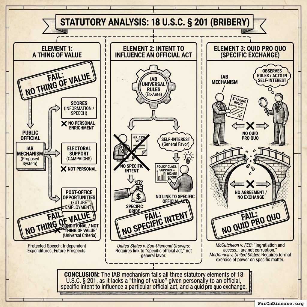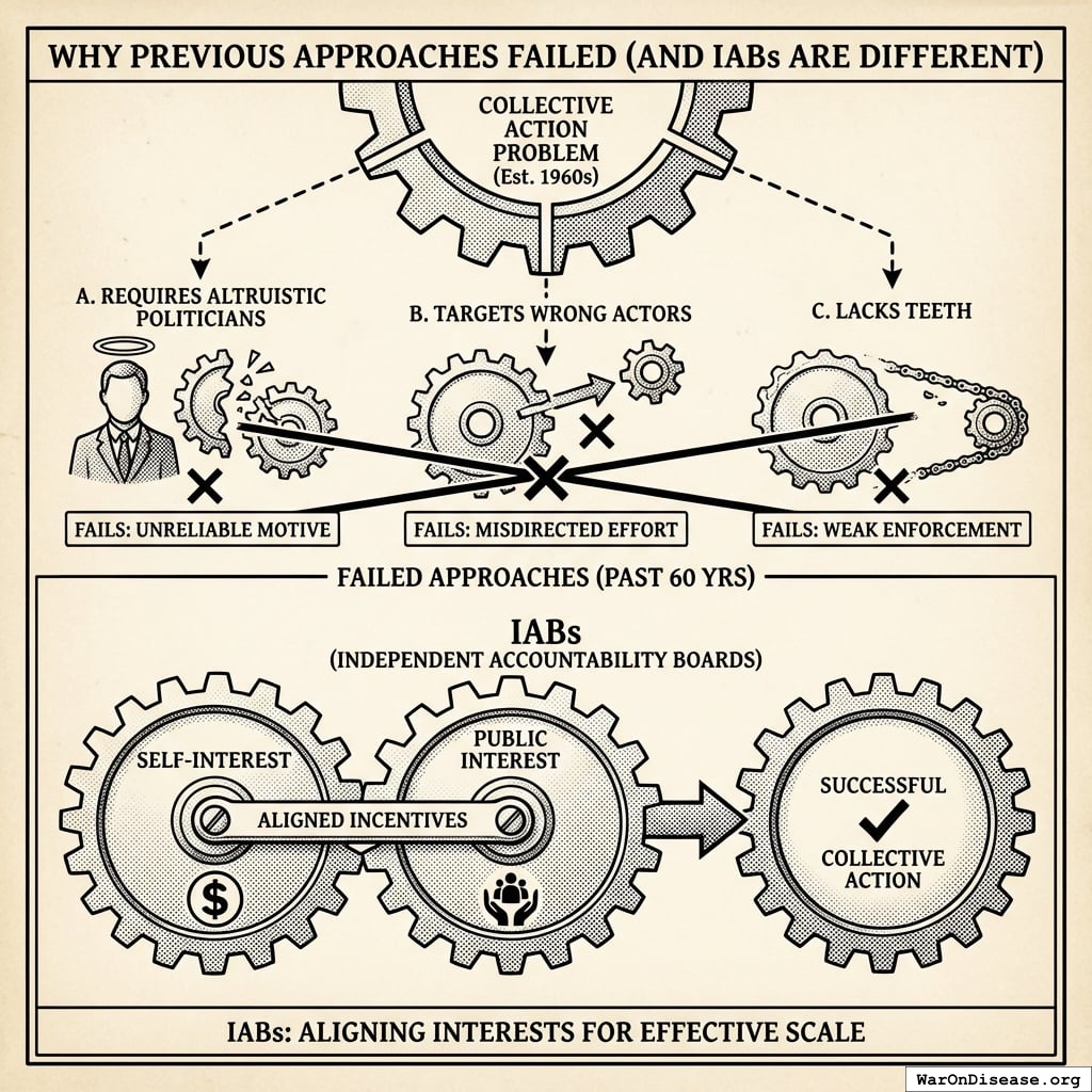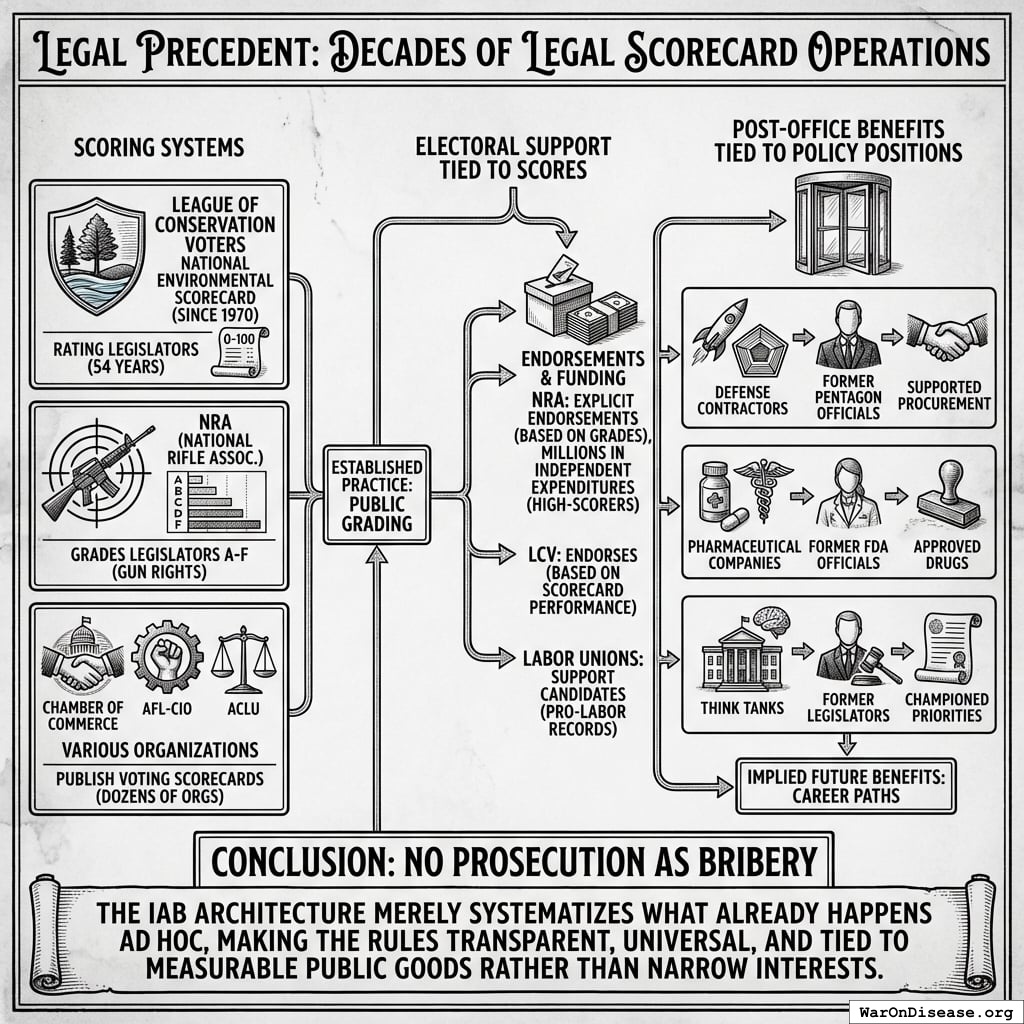 A natural objection: “How is this not just PACs + voter scorecards + SIBs?” The answer is that existing mechanisms fail to solve the Olsonian problem because they operate in isolation. PACs exist but remain dominated by concentrated interests due to the 90:1 capital asymmetry. Scorecards exist (League of Conservation Voters, NRA ratings) but lack teeth without accompanying financial incentives. SIBs exist but require government to agree upfront, which faces the same collective action problem IABs solve. IABs integrate all three components (investor capital, electoral accountability, post-office incentives) into a single instrument where each component’s effectiveness depends on the others, and where the funding mechanism creates permanent financial incentives for diffuse beneficiaries to overcome collective action barriers. The whole is greater than the sum of its parts because the integrated architecture makes coordinated capital deployment economically rational for millions of individual investors.
