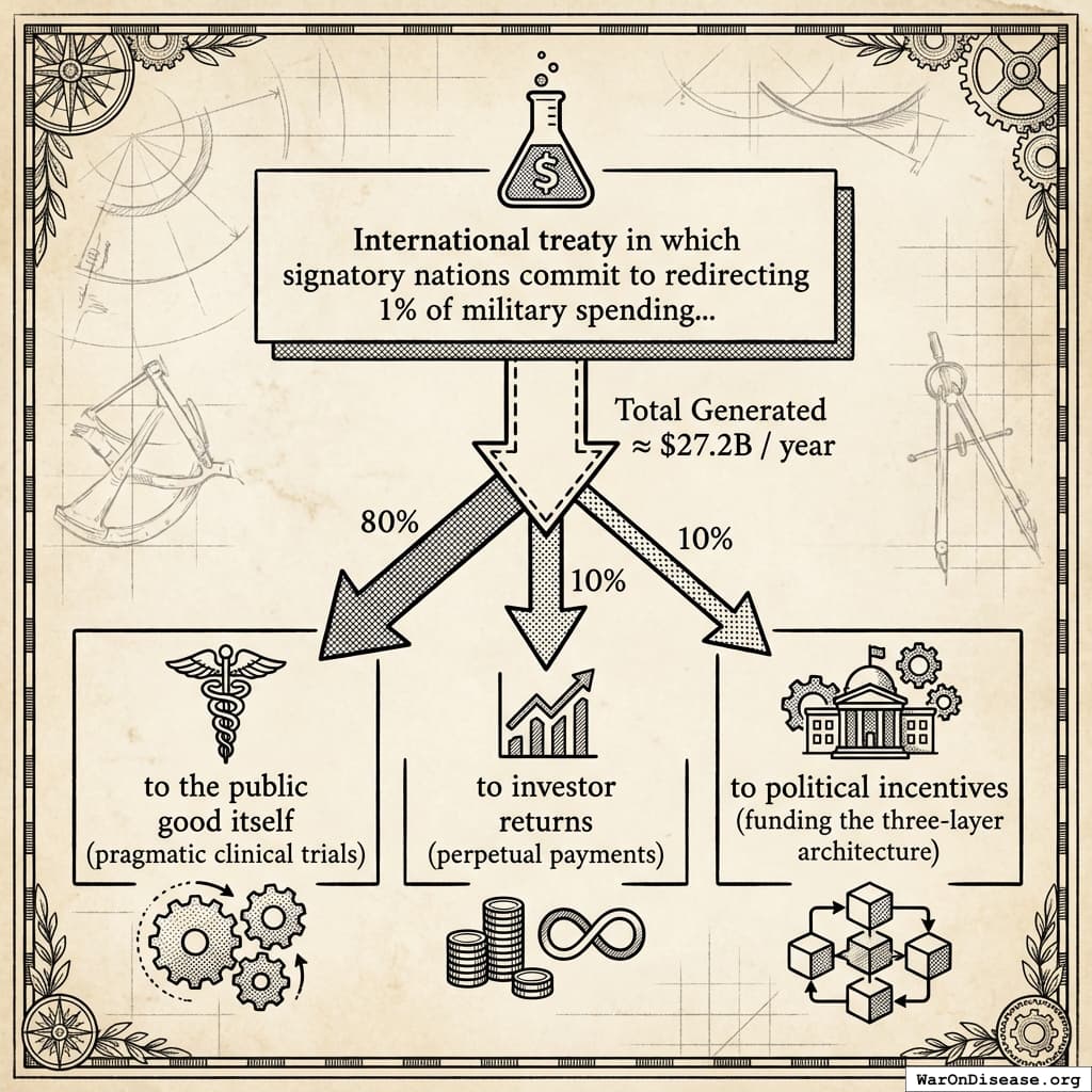 IABs break this dynamic by specifying the funding source as part of the mechanism. The policy does not say “fund pragmatic clinical trials”; it says “redirect 1% of military spending to pragmatic clinical trials.” This forces a real reallocation: