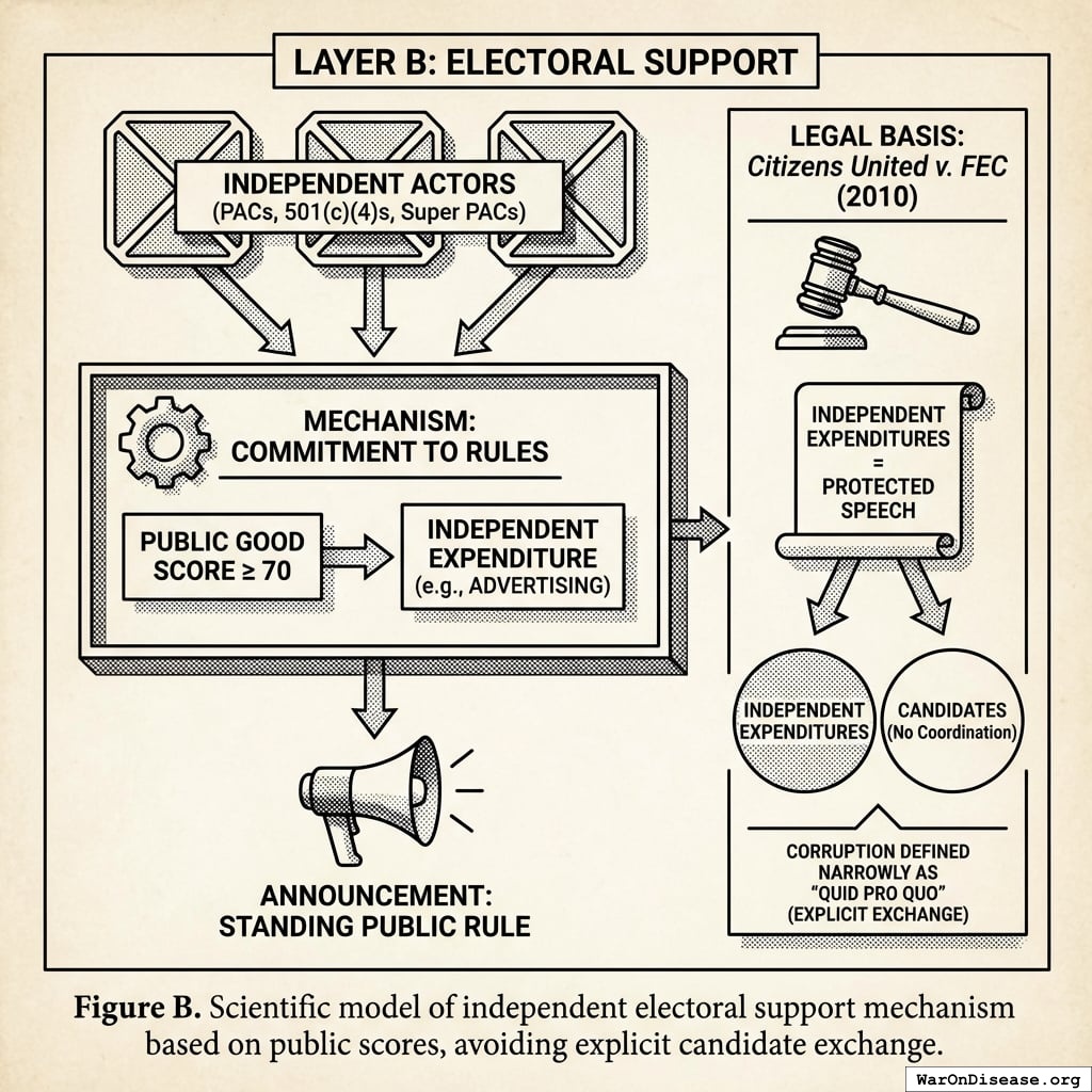 Electoral layer specification. Peace-focused PACs commit to independent expenditure rules analogous to the climate case, with thresholds calibrated to the nuclear policy domain.