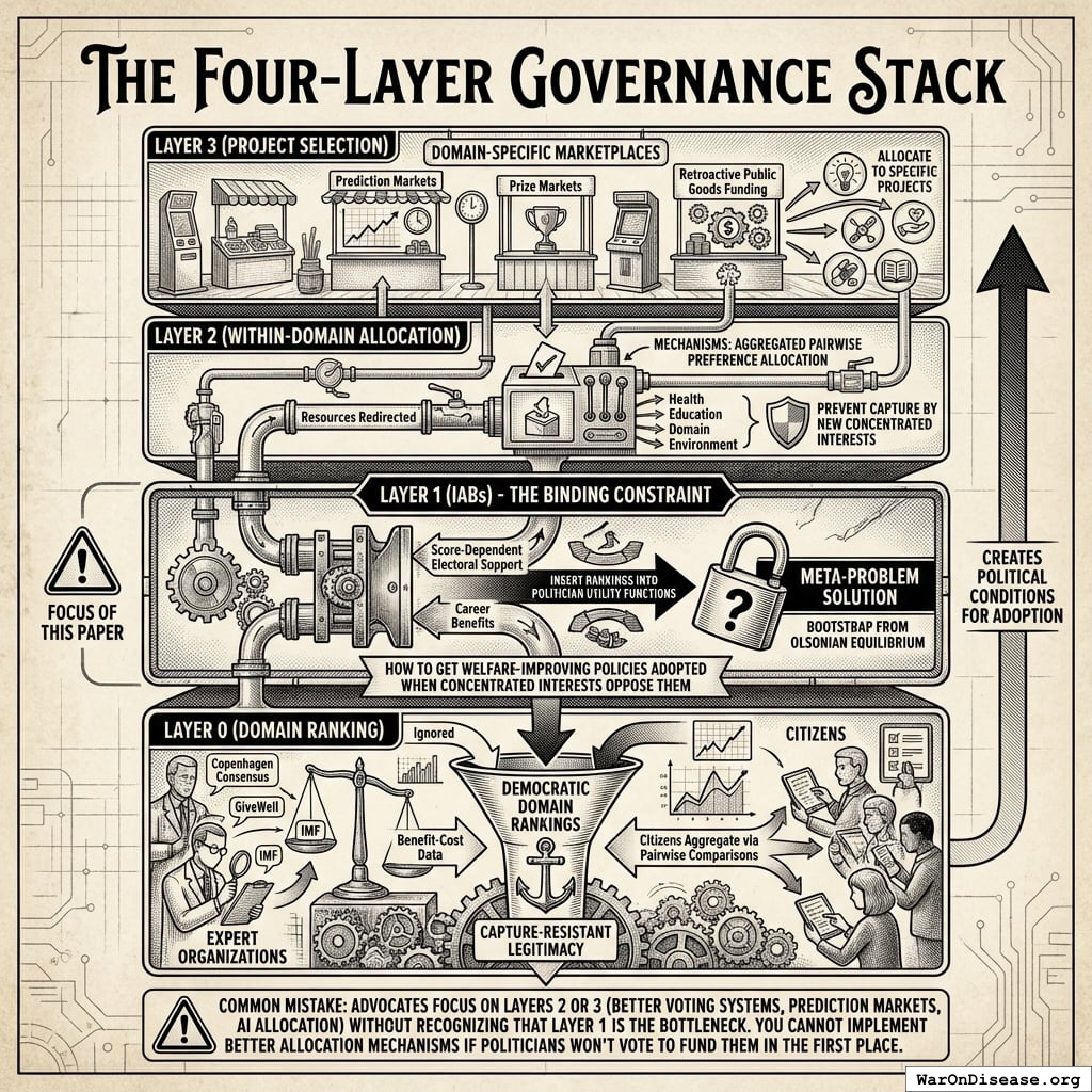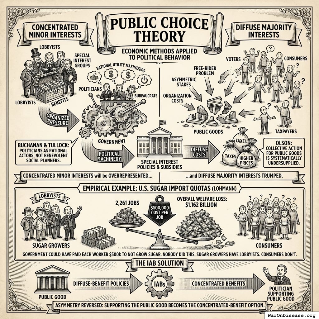 The third property is crucial. Many government expenditures persist not because they produce social value, but because their beneficiaries are concentrated while their costs are diffuse. Military spending beyond deterrence requirements. Agricultural subsidies that distort markets. Fossil fuel subsidies that accelerate climate change. These programs survive political competition not on merit but on lobbying intensity. Concentrated interests (military contractors, incumbent industries) invest heavily in maintaining these programs, while diffuse beneficiaries face collective action problems. IABs redirect these resources to measurable public goods, making the reallocation welfare-improving even before accounting for the public good produced.