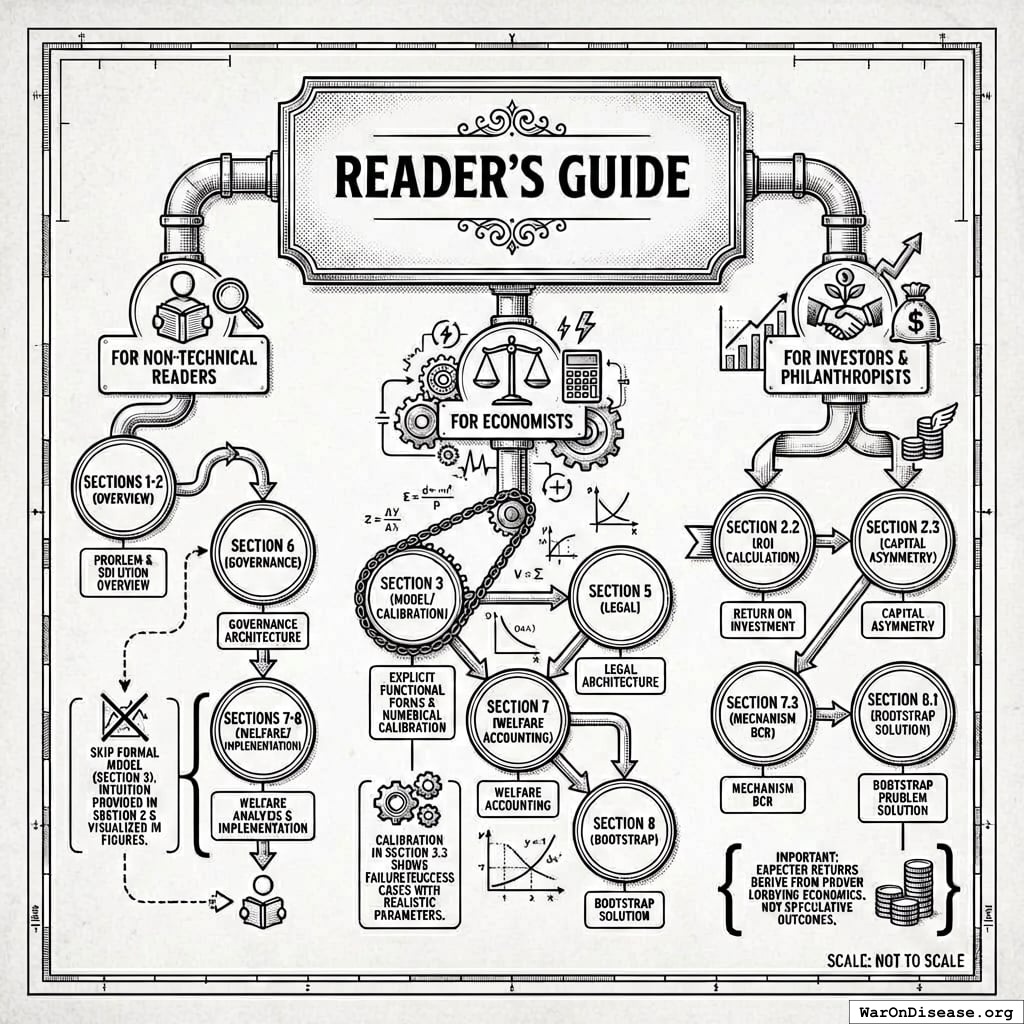 Non-technical readers can skip Section 3 (formal model); the intuition is provided in Section 2. Economists should focus on Section 3 (explicit functional forms) and Section 7 (welfare accounting). Investors should focus on Section 2.2-2.3 (ROI and capital asymmetry) and Section 8 (bootstrap solution).