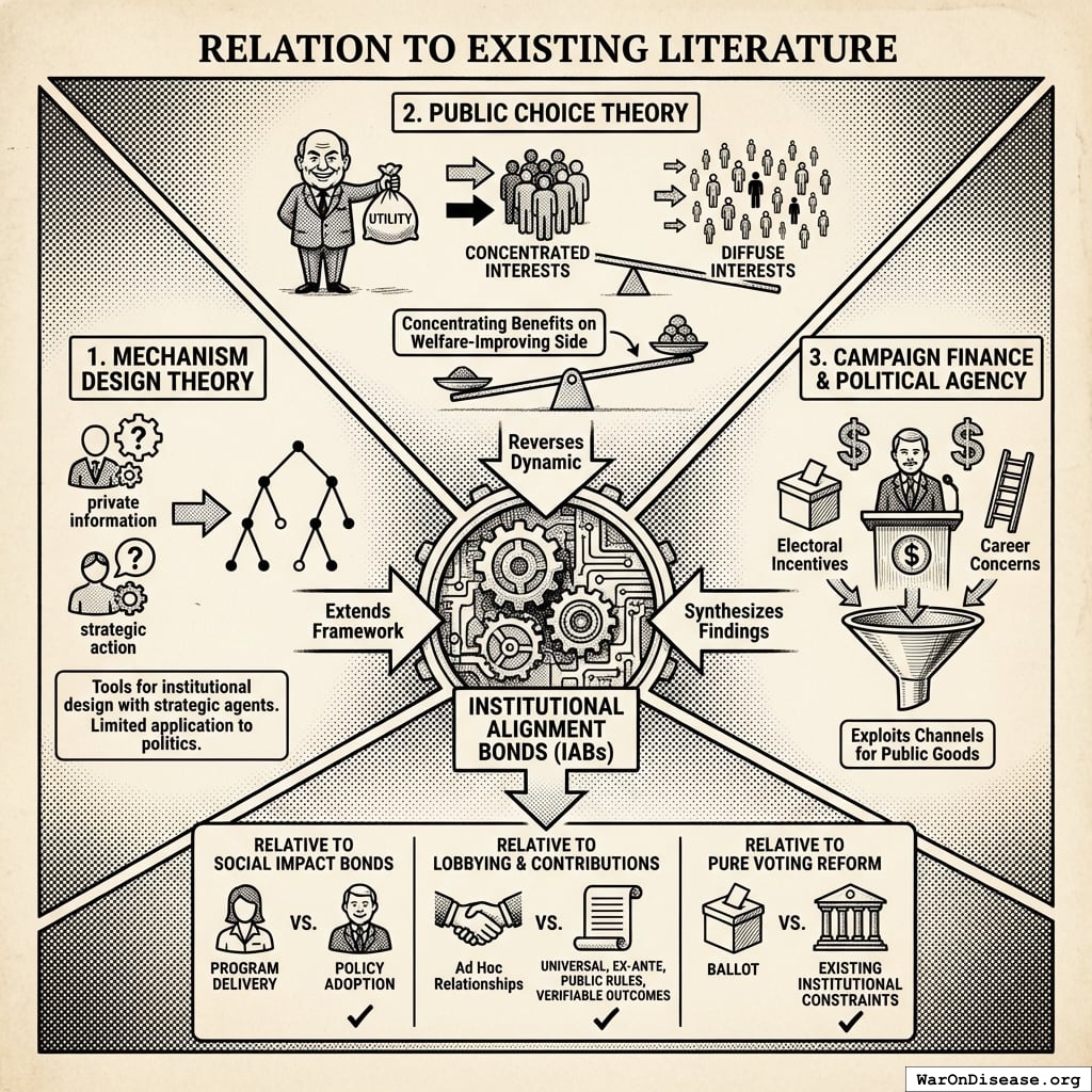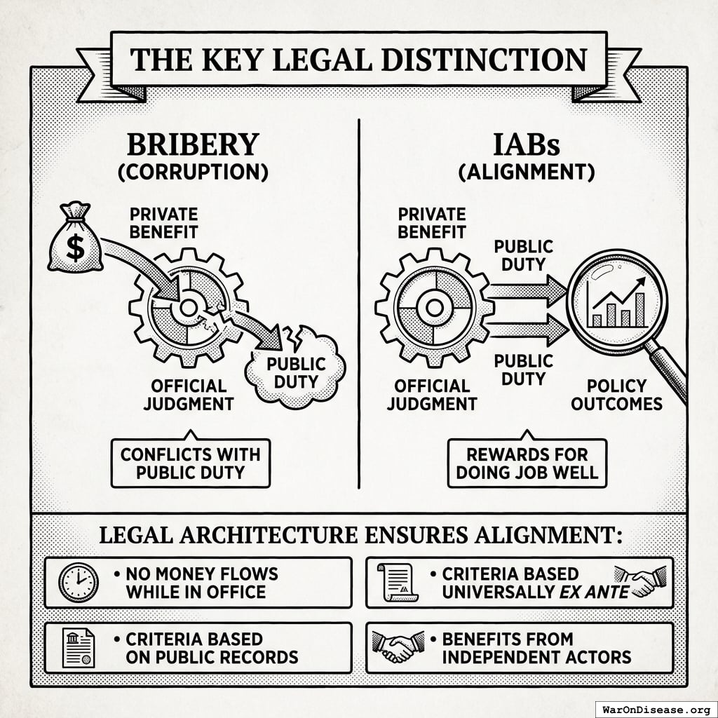 Unlike Social Impact Bonds (which align service providers with program outcomes), IABs align the actors who control large-scale budget decisions, the politicians, with public-good production. Unlike lobbying (which aligns politicians with narrow interests), IABs align politicians with measurable, welfare-improving outcomes. Unlike campaign contributions (which are ad hoc and candidate-specific), IABs create universal, ex-ante rules tied to objective metrics. And unlike new taxation or deficit spending, IABs fund public goods by displacing harmful or wasteful expenditure.