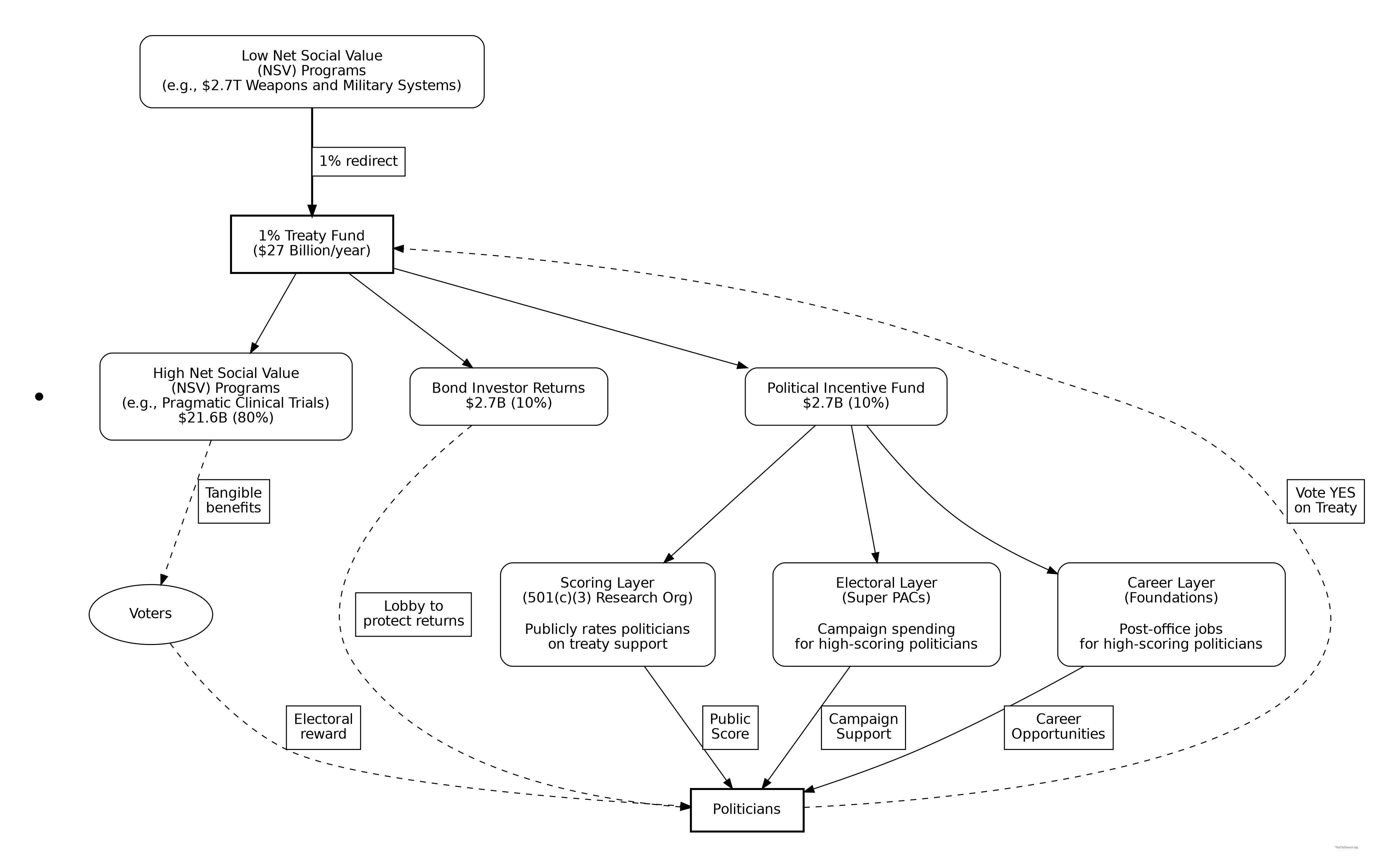 The key innovation is that all three alignments reinforce each other. A fraction of redirected funding flows perpetually to (a) investor returns and (b) political incentive mechanisms, while (c) the funding source ensures no beneficial programs are displaced. This makes the instrument self-sustaining: policy success generates the resources that maintain both investor and politician alignment, creating pressure for continuation and expansion.