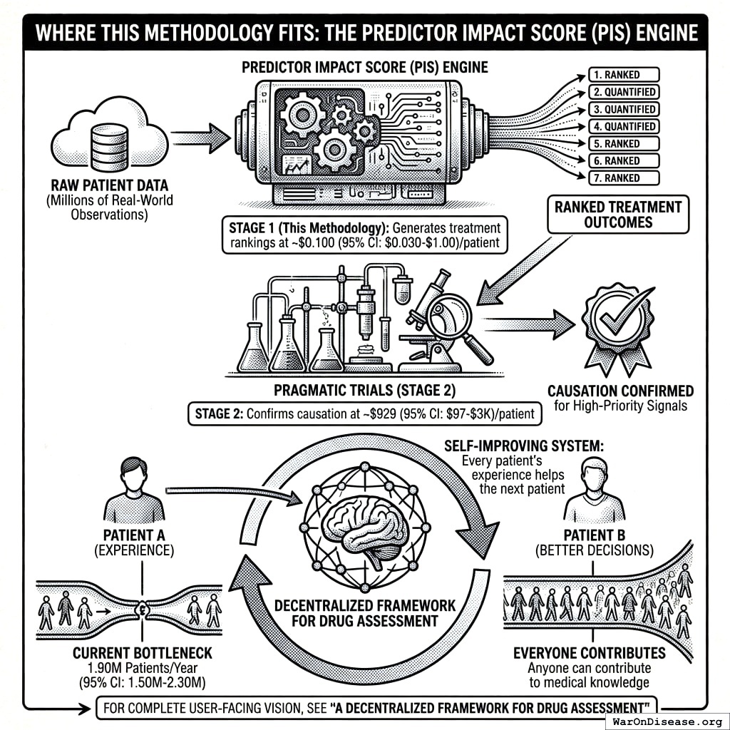 Stage 1 (Signal Detection): Aggregated N-of-1 observational analysis146,147 integrates data from millions of individual longitudinal natural experiments. The methodology applies temporal precedence analysis with automated hyperparameter optimization, addresses six of nine Bradford Hill causality criteria through a composite Predictor Impact Score (PIS), and produces ranked treatment-outcome hypotheses at ~$0.1 (95% CI: $0.03-$1).