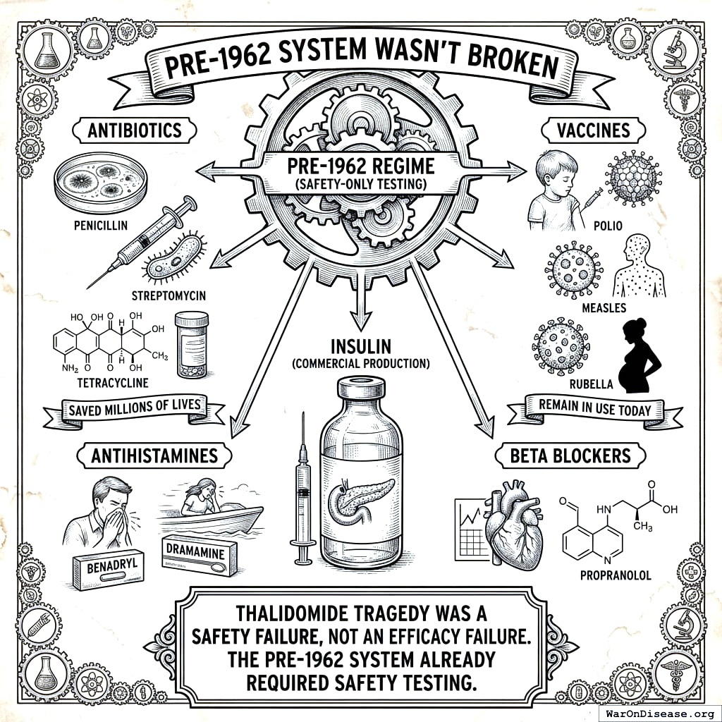 These drugs saved millions of lives and remain in use today. The thalidomide tragedy was a safety failure, not an efficacy failure. The pre-1962 system already required safety testing.