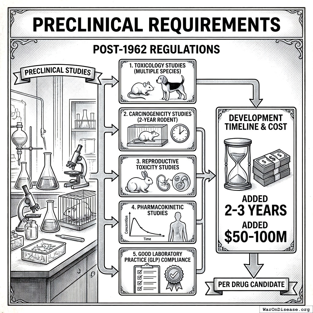 Post-1962 regulations added years of preclinical work before you can touch a human: