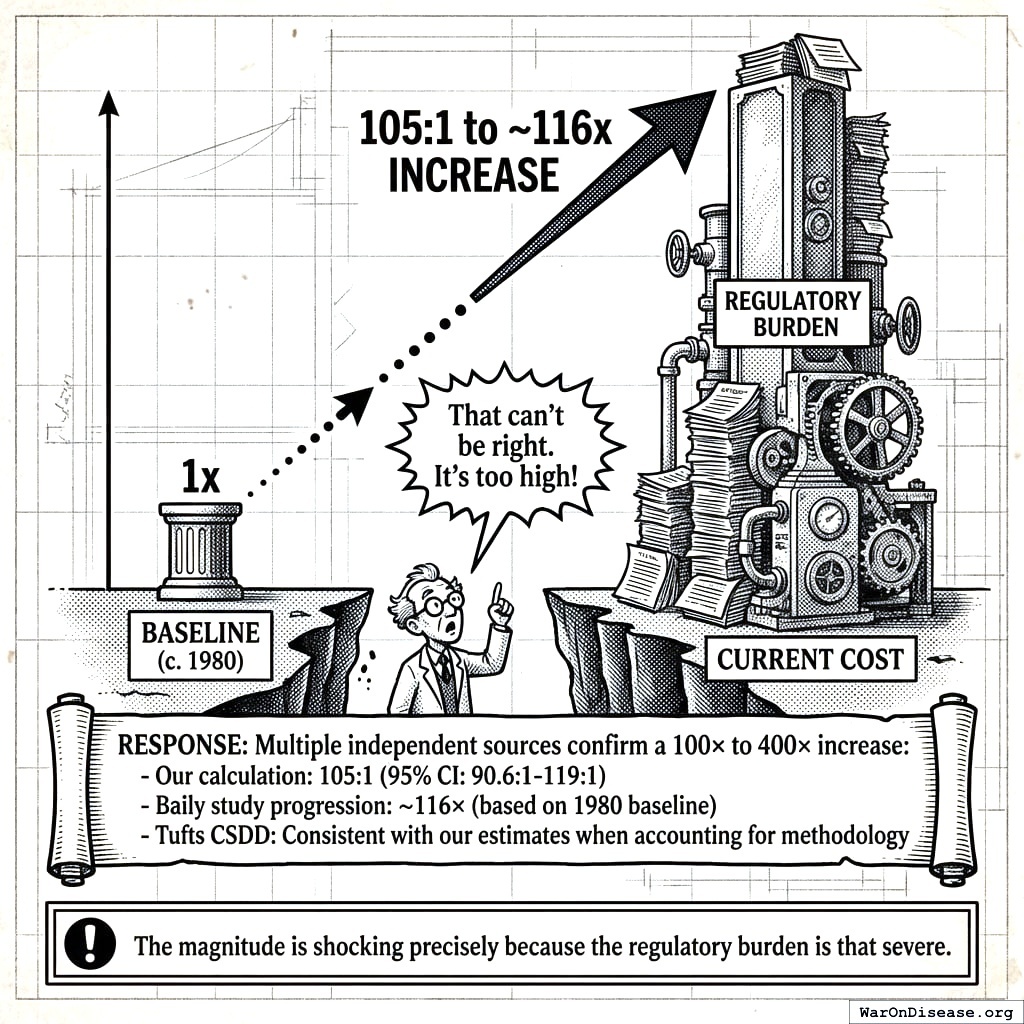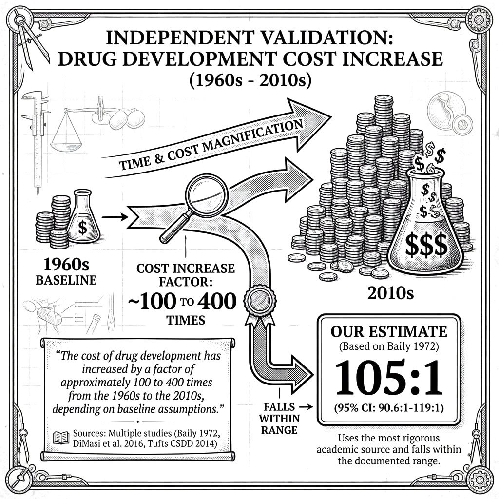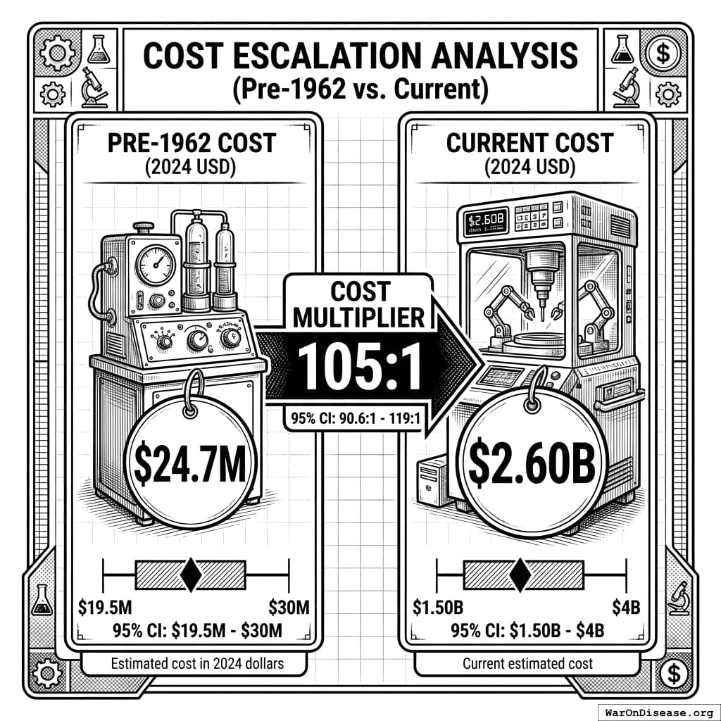 The 105x (95% CI: 90.6x-119x) real cost increase is well-documented, conservative (some estimates hit 400x), and fixable. Multiple independent sources agree on the trajectory. The math is transparent. And the RECOVERY trial proved you can reverse it.