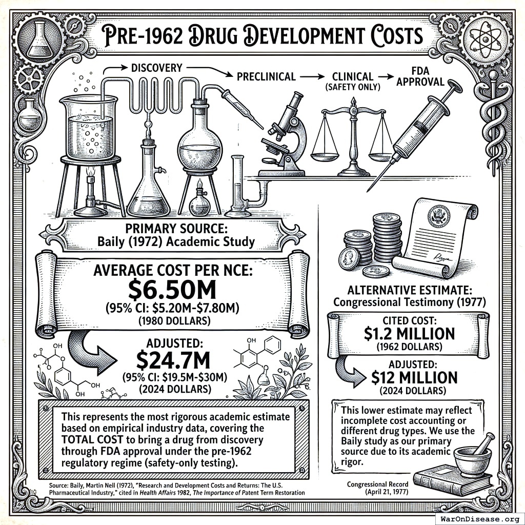 This covers the total cost to bring a drug from discovery through FDA approval under the pre-1962 regime (safety-only testing). It’s the best academic estimate available.