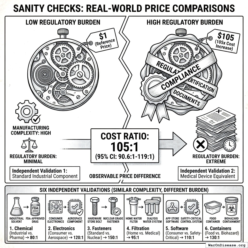 Cross-Validation: All Six Checks Confirm 105x (95% CI: 90.6x-119x) Development Cost Increase