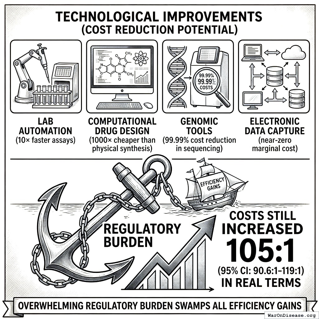 …costs still increased 105x (95% CI: 90.6x-119x) in real terms. This demonstrates the overwhelming regulatory burden that swamps all efficiency gains.