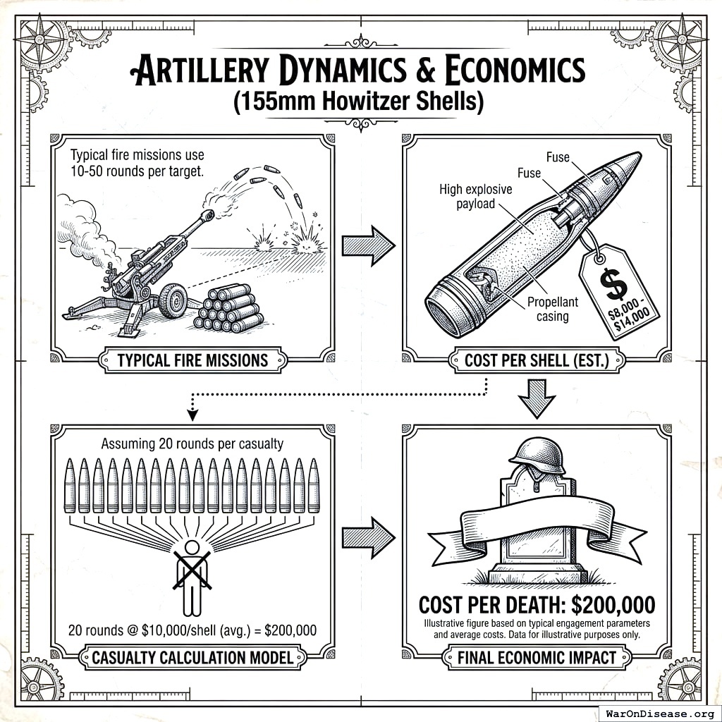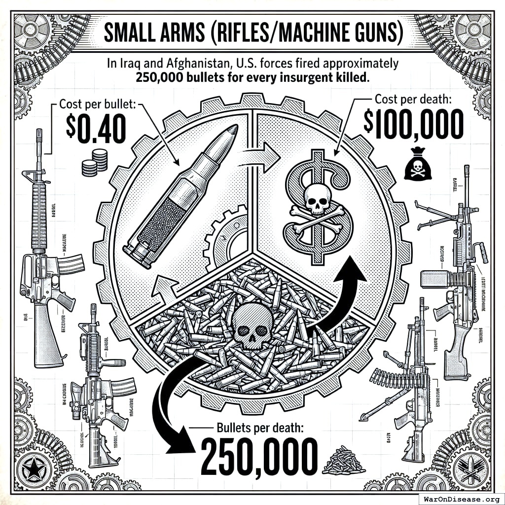 This is more modest than the 20x figure from the purchasing-power calculation above. It is also more terrifying. The purchasing-power metric asks “what could the budget buy?” The arsenal metric asks “what have you already built?” The answer: 2.8 times the weapons needed to starve 5 billion people to death in darkness.