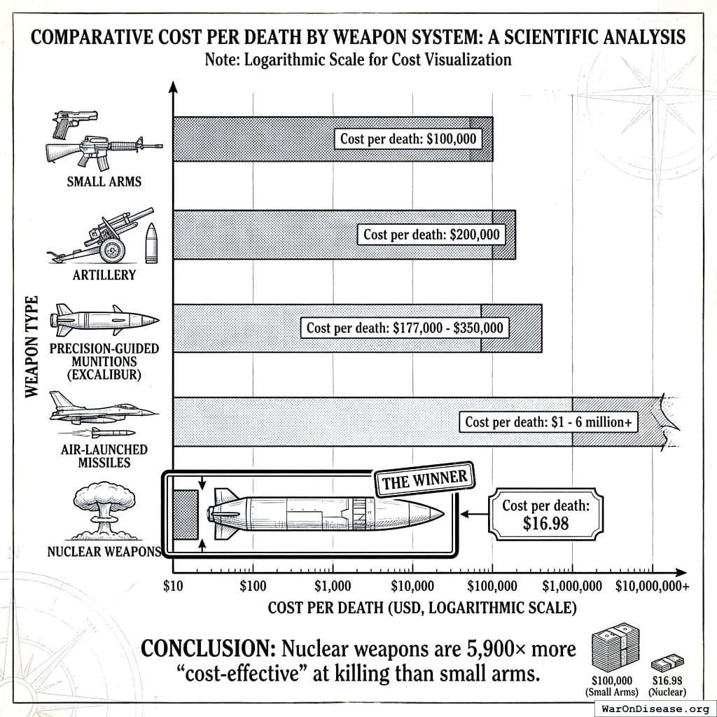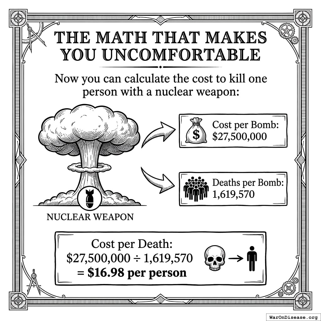 Now that you know nuclear weapons cost $16.98 per death, you can compare them to other methods of killing people. This is the darkest optimization problem in human history. But here we are.