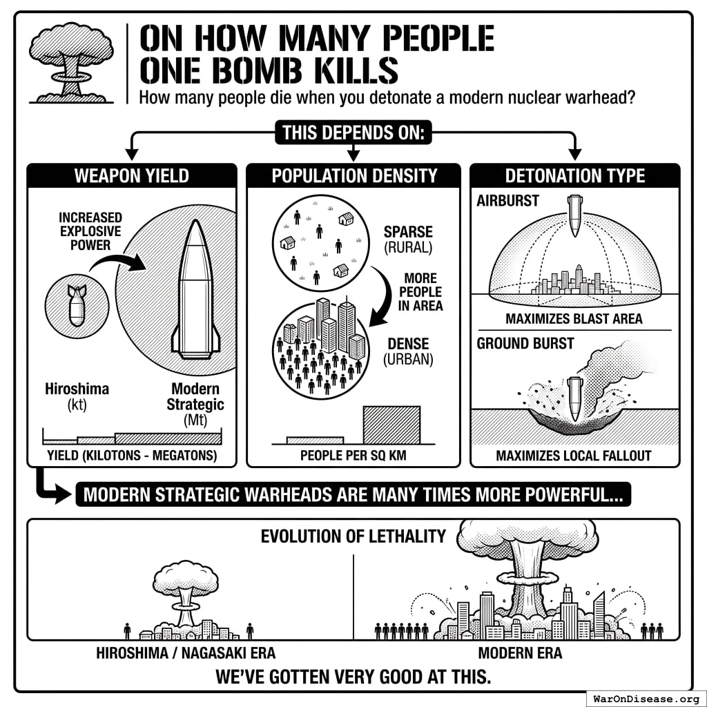 A single warhead detonated over Manhattan kills 1.6 million people from blast, heat, and radiation. That is the upper bound: the densest urban target on Earth hit by a modern strategic weapon. Across a realistic mix of military, industrial, and urban targets, the average drops to roughly 50,000-100,000 deaths per warhead.