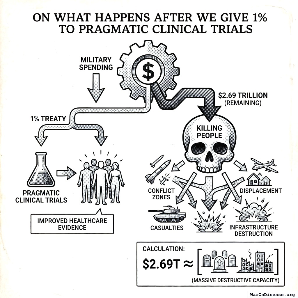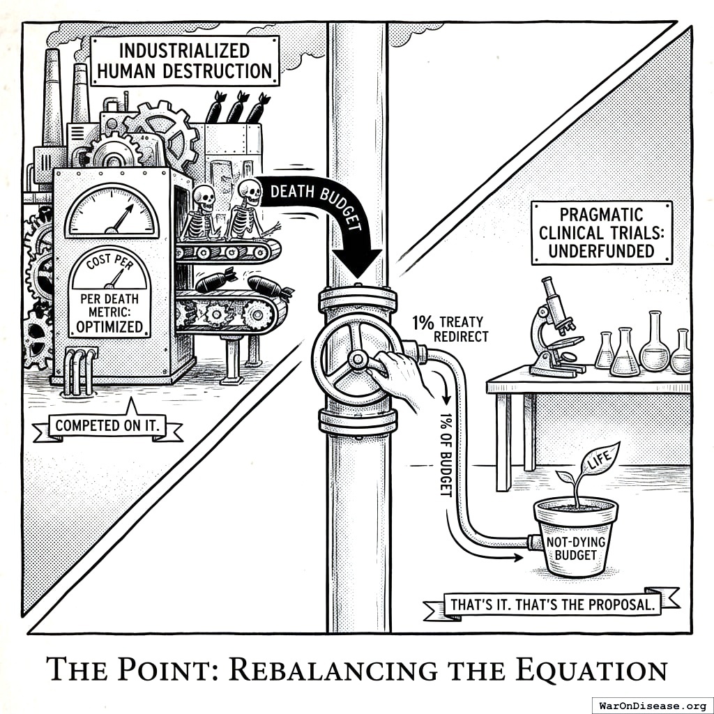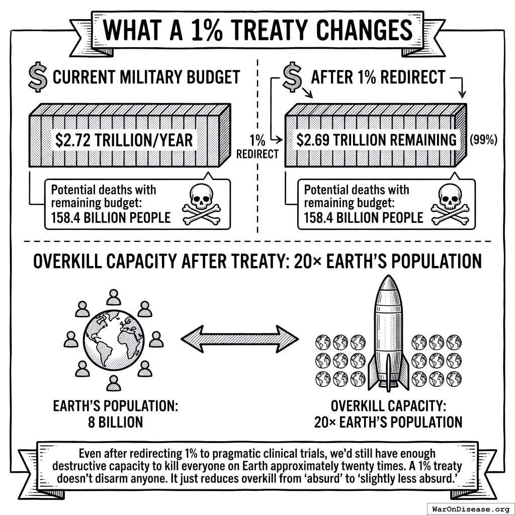 A 1% treaty146 asks for $27.2 billion from this surplus. It does not touch deterrence. It does not touch nuclear arsenals. It does not touch conventional readiness. It takes from the budget that sits on top of an extinction guarantee and redirects it to clinical trials.