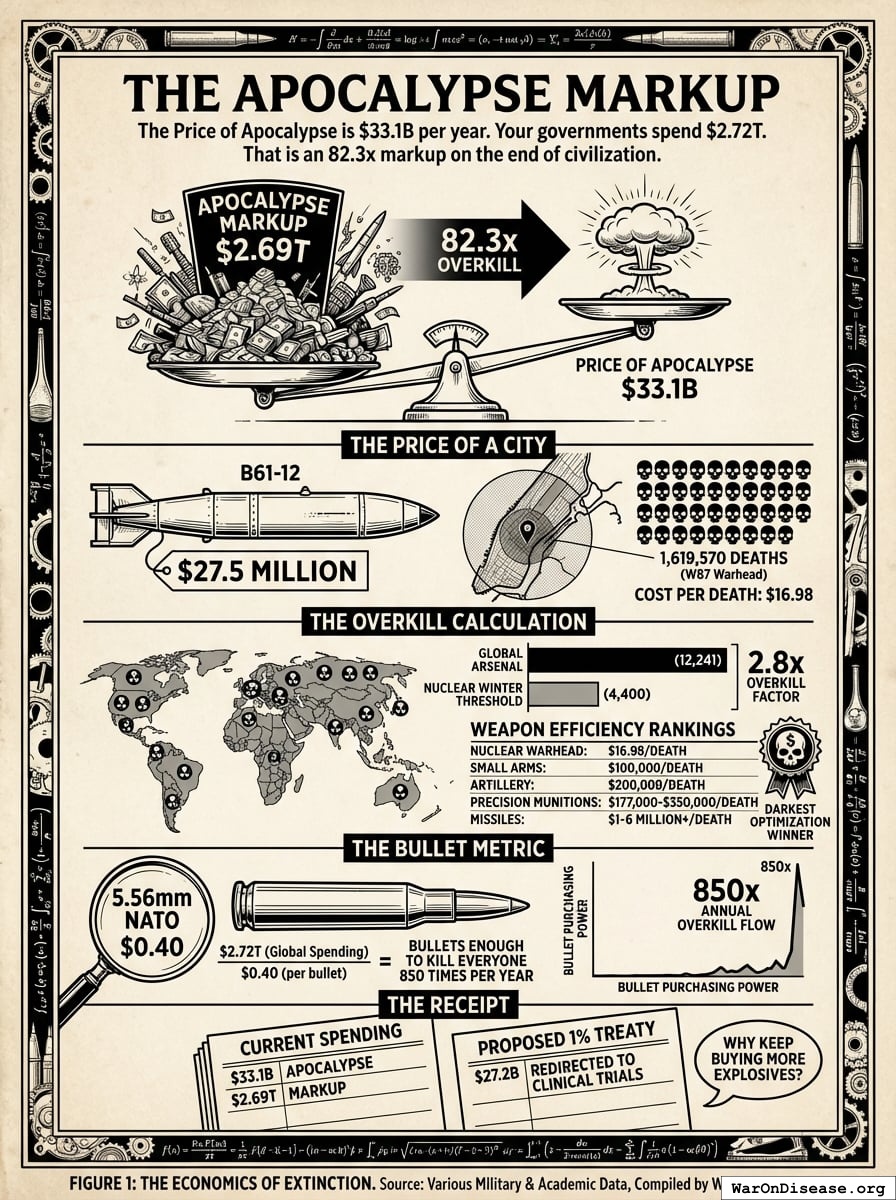 The Price of Apocalypse is $33.1 billion (95% CI: $23.7 billion-$44 billion) per year. That is the cost of maintaining enough nuclear warheads to trigger nuclear winter once, killing roughly 5 billion people. Your governments spend $2.72 trillion on military. That is an 82.3x (95% CI: 61.9x-115x) markup on the end of civilization.