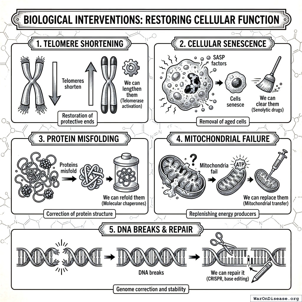 - Cells senesce: clear them (senolytic drugs)