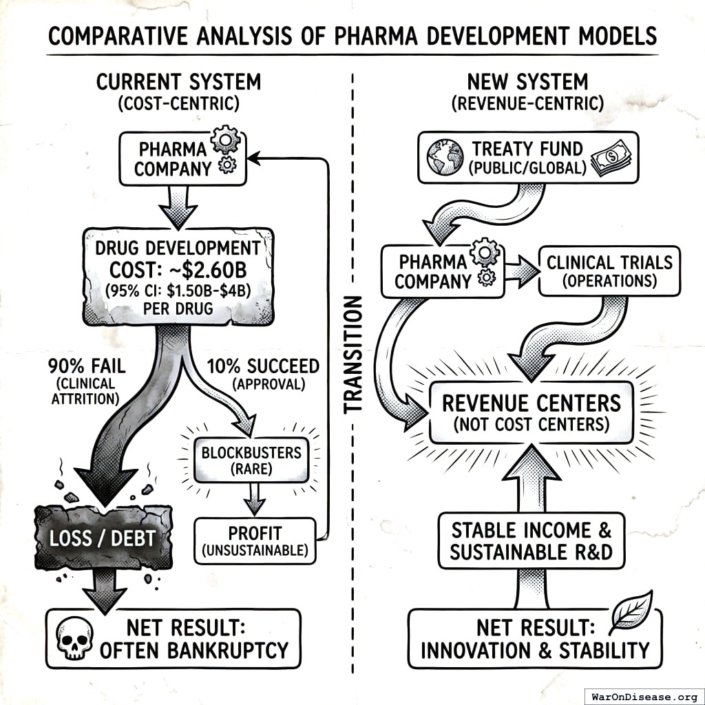 Pharma currently pays $2.6 billion (95% CI: $1.5 billion-$4 billion) per drug. 90% fail. This is called “drug development.” On Wishonia, we have a different word for spending billions with a 10% success rate. We call it “gambling.”
