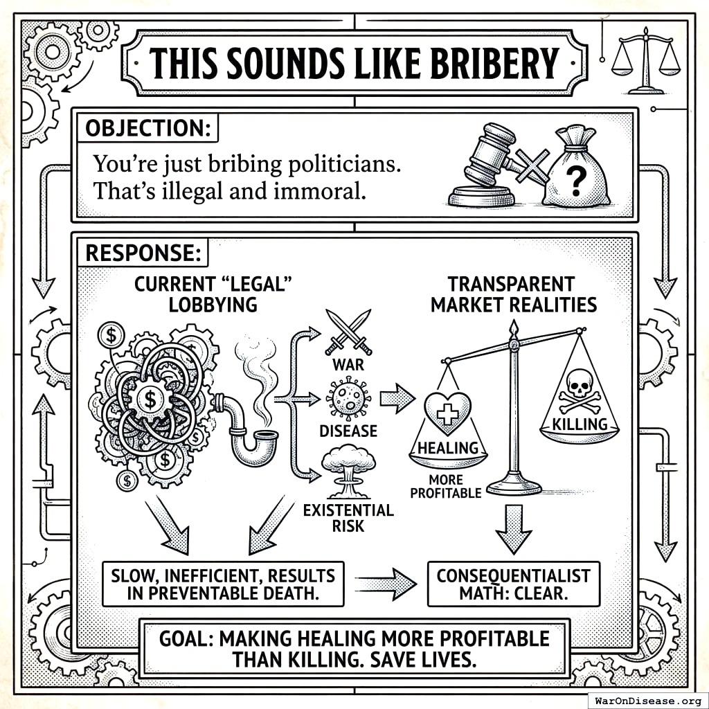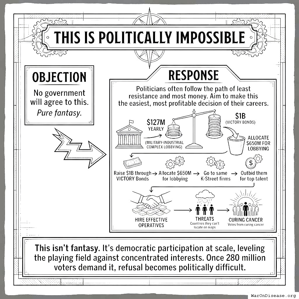 The military-industrial complex spends $127 million (95% CI: $100 million-$160 million) yearly on lobbyists. You can’t beat them with moral arguments (they’re immune; moral arguments have a $0 budget and no K Street address). Beat them at their own game. Raise $1 billion through VICTORY Incentive Alignment Bonds150. Allocate $650 million for lobbying. That overwhelms the defense industry’s $127 million (95% CI: $100 million-$160 million) spend. Go to the same K Street firms. Outbid them. Lobbyists work for the highest bidder. They always have. This is the one area where your species’ mercenary instincts are genuinely helpful.