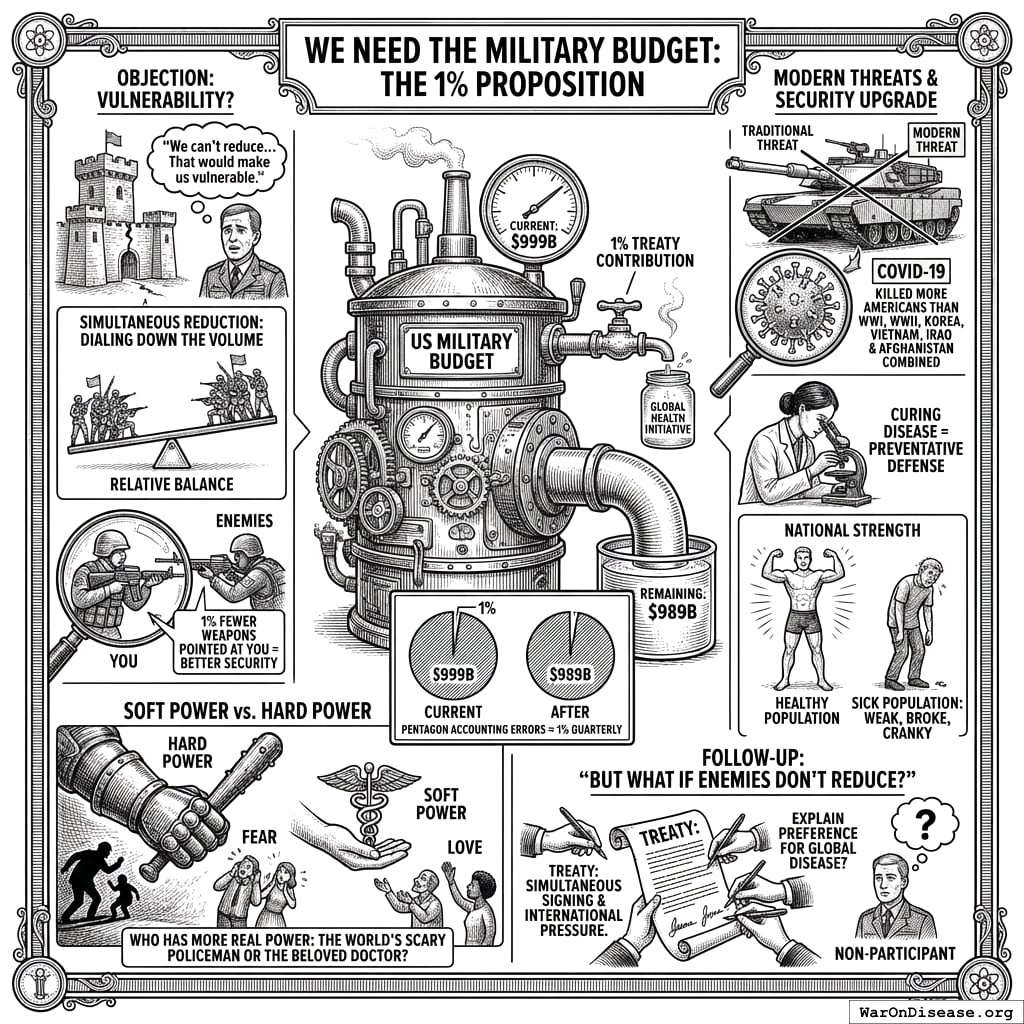 COVID-19 killed more Americans than World War I, World War II, Korea, Vietnam, Iraq, and Afghanistan combined. Your nearly $900 billion murder budget watched it happen, fully armed and completely confused. The virus did not check your passport. It did not consult your defense posture. It did not read your threat assessment. Disease is the only enemy that attacks every nation simultaneously, charges no import tariffs, and has never once considered your feelings about geopolitics. You are the only species that needs to be talked into fighting it.