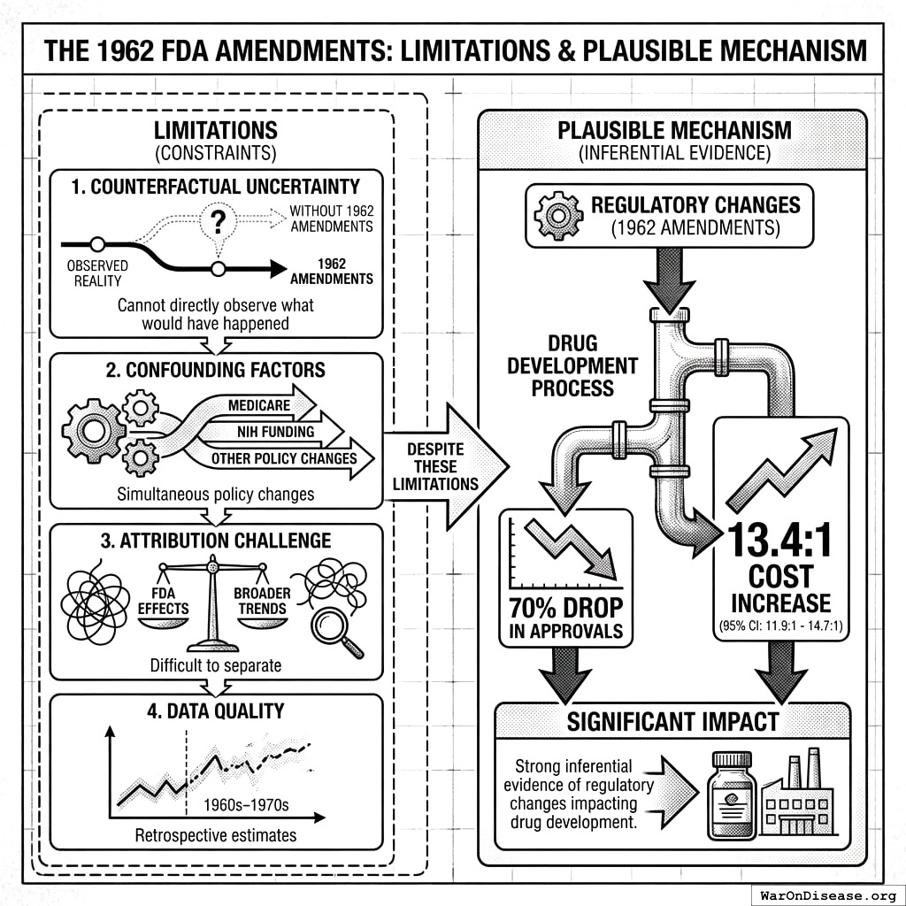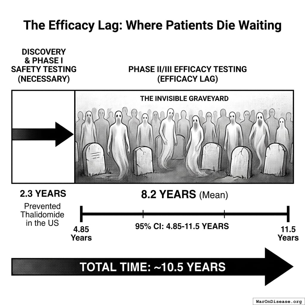 This study quantifies the cumulative mortality and morbidity costs associated with the Unitary Pre-Market Approval (UPMA) model mandated by the 1962 Kefauver-Harris Amendments. By enforcing efficacy testing prior to market entry, the current regulatory framework imposes an average “Efficacy Lag” of 8.2 years (95% CI: 4.85 years-11.5 years) post-safety verification.