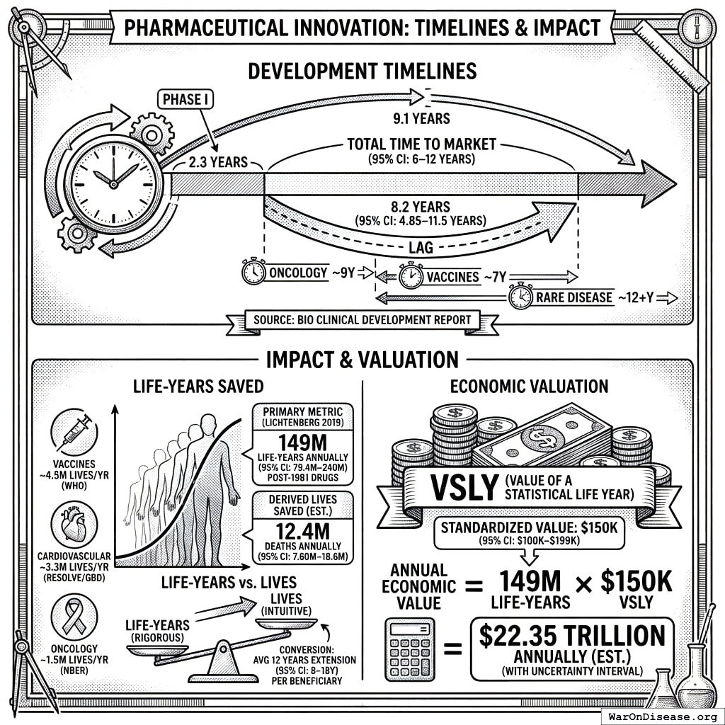 Historical mortality (1962-2024): Approximately 102 million people died waiting for approved drugs during their 8.2 years (95% CI: 4.85 years-11.5 years) approval delays. This is a lower bound - it excludes drugs never developed due to cost barriers.