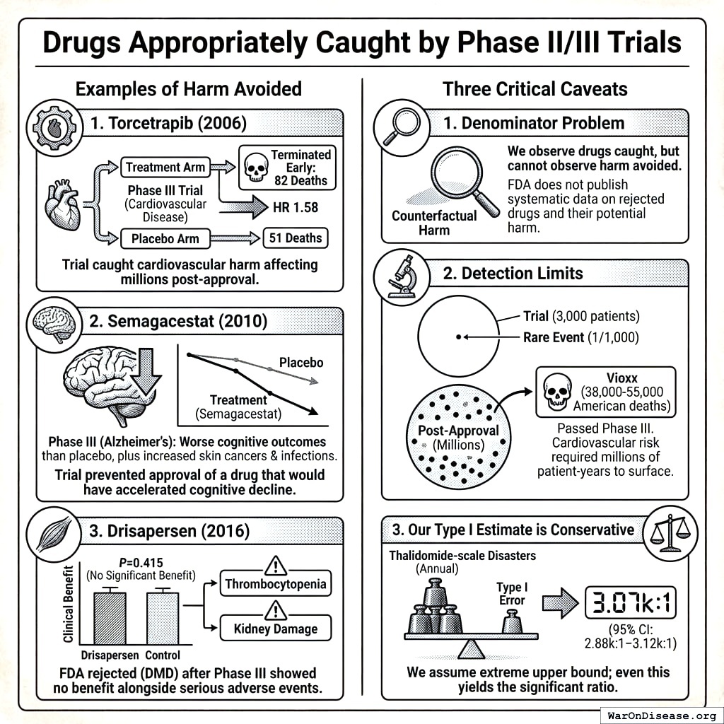 Phase III trial of gamma-secretase inhibitor semagacestat for Alzheimer’s disease was terminated early by Eli Lilly. Patients on treatment showed significantly WORSE cognitive outcomes than placebo, plus increased skin cancers and infections. 1,537 patients randomized. Example of Phase III trial preventing approval of a drug that would have harmed patients.