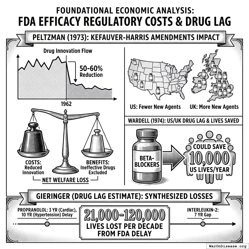 The regulatory cost of FDA efficacy requirements was first rigorously quantified by Peltzman146, who estimated that the 1962 Kefauver-Harris Amendments reduced the flow of new drugs by 50-60%. His analysis concluded that the costs of reduced pharmaceutical innovation substantially exceeded any benefits from keeping ineffective drugs off the market, resulting in net welfare losses to society.