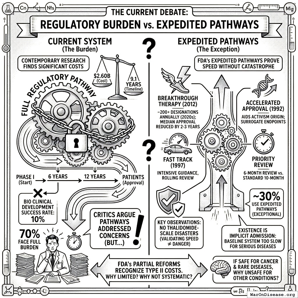 Critics argue that faster approval pathways (breakthrough therapy designation, accelerated approval) have addressed these concerns. However, these pathways actually support our argument: