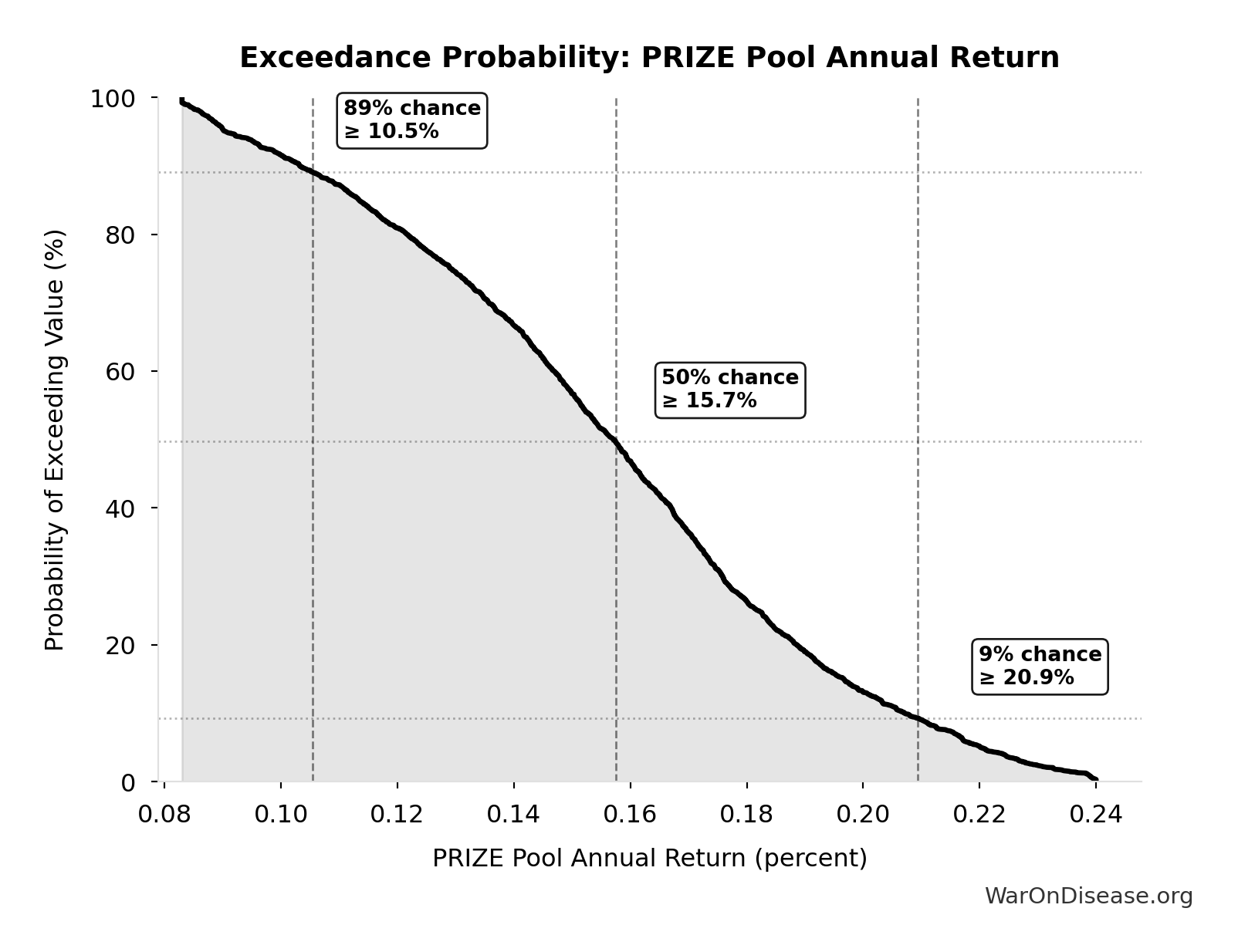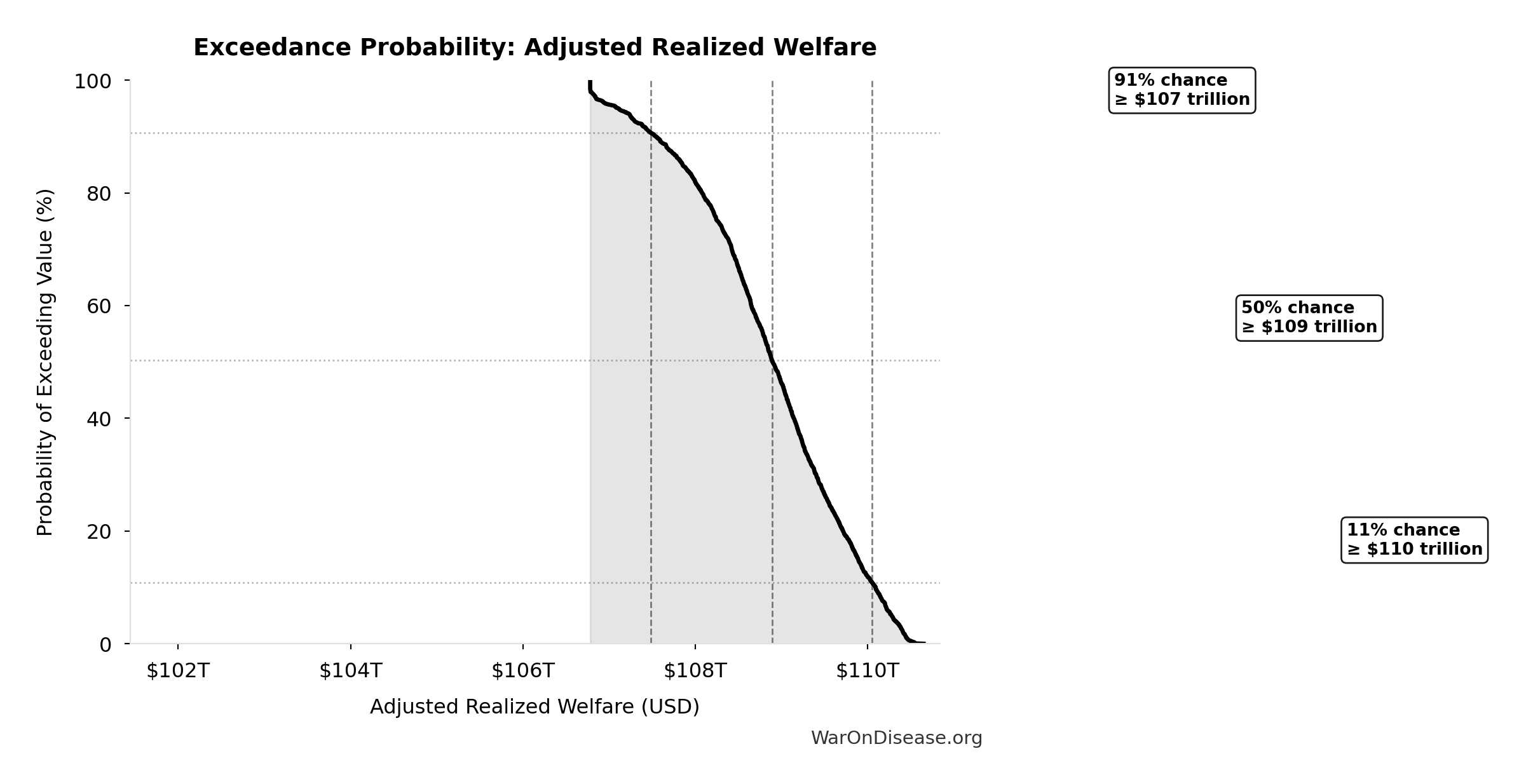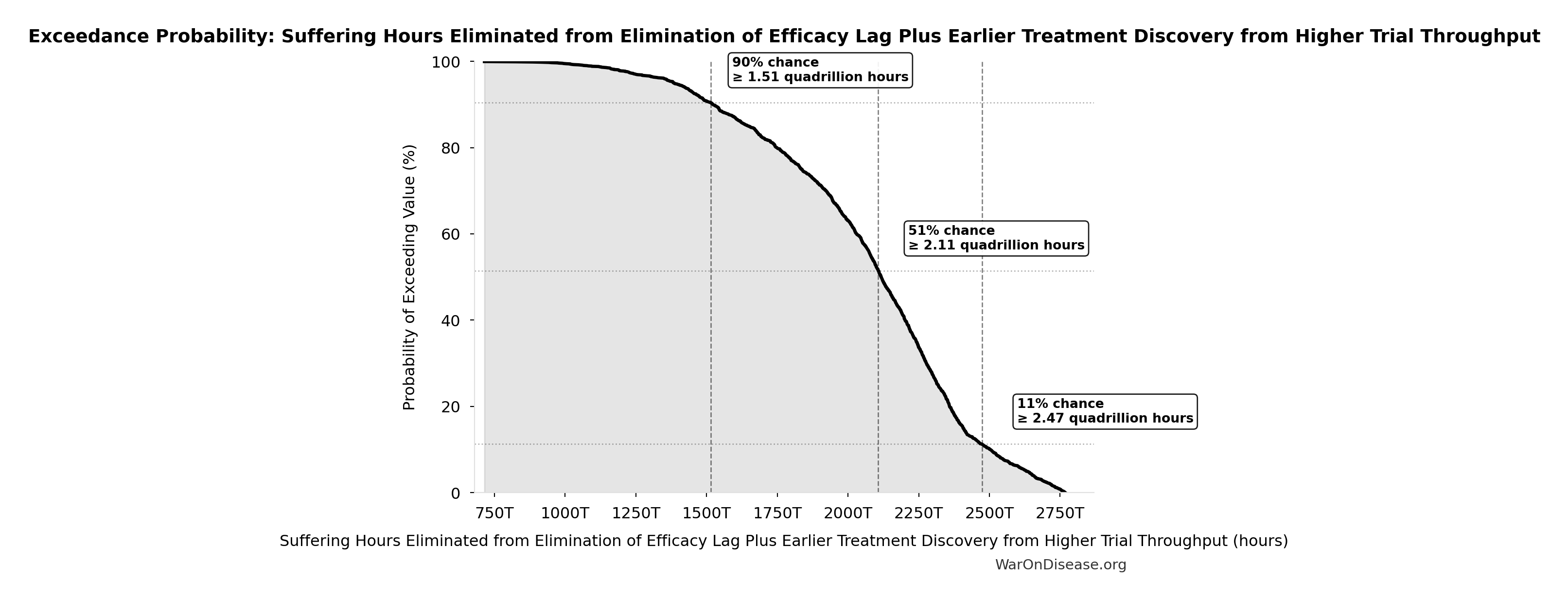 This exceedance probability chart shows the likelihood that Best-Practice Life Expectancy Gain will exceed any given threshold. Higher curves indicate more favorable outcomes with greater certainty.