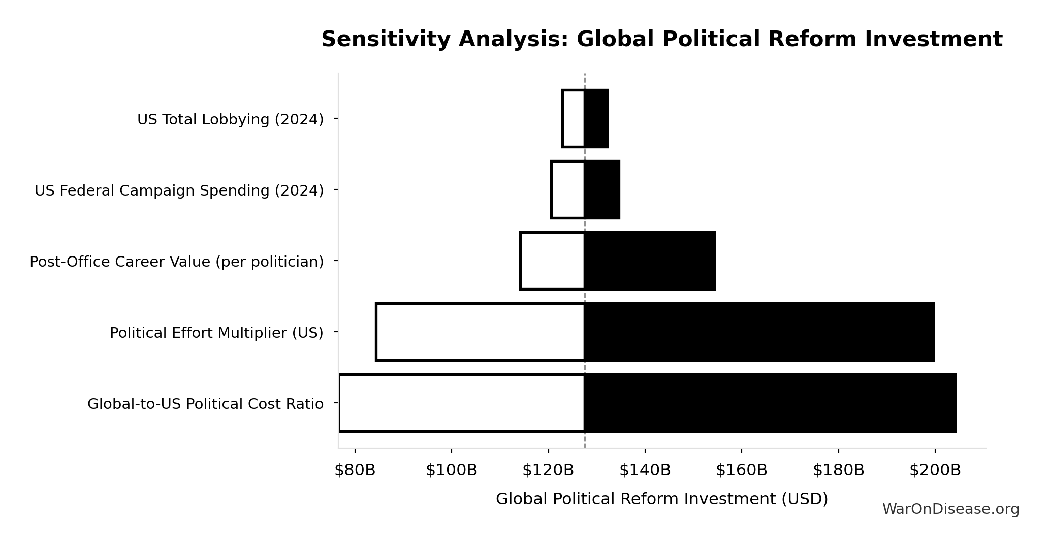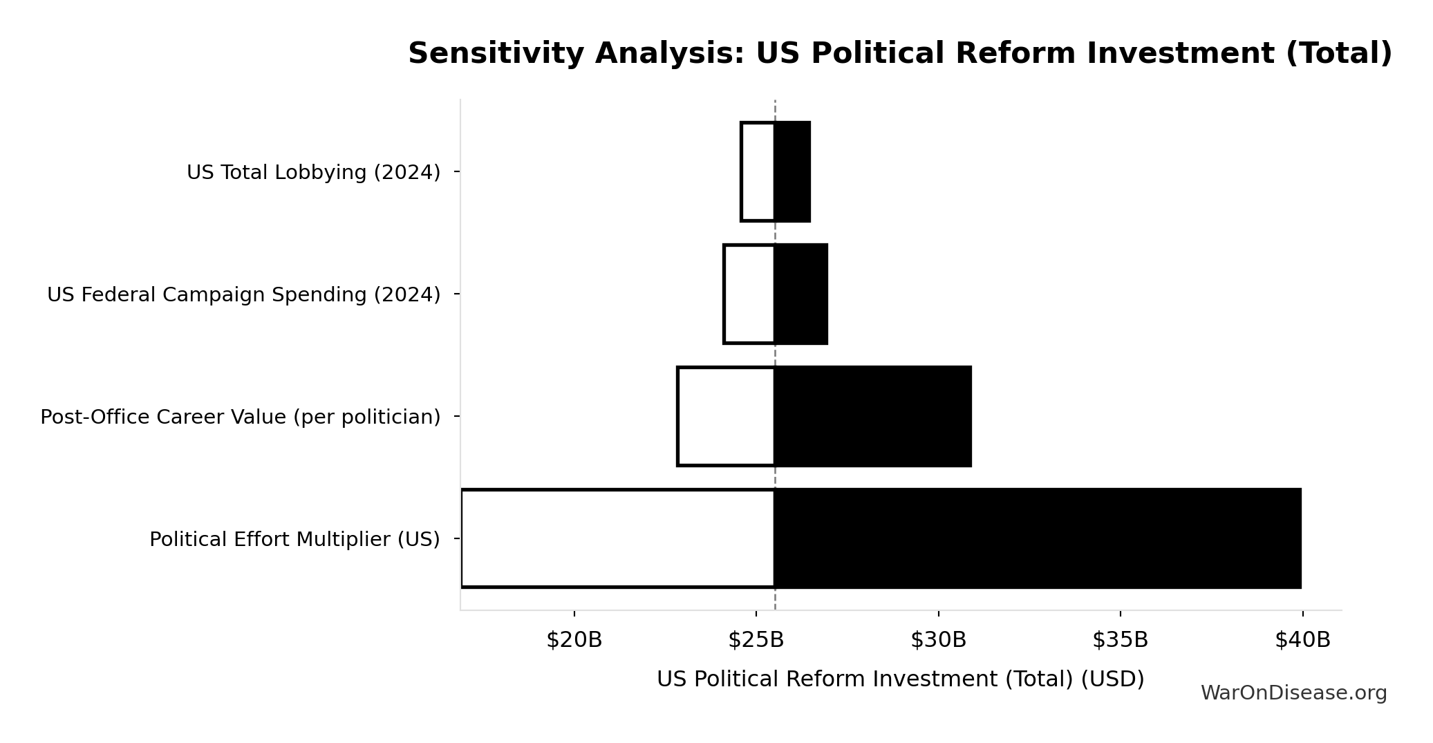 Fraction of campaign + lobbying spending needed to achieve policy reform. Accounts for efficiency gains from coordination, message clarity, and public interest alignment. Range 0.4-1.2 reflects uncertainty about political dynamics.