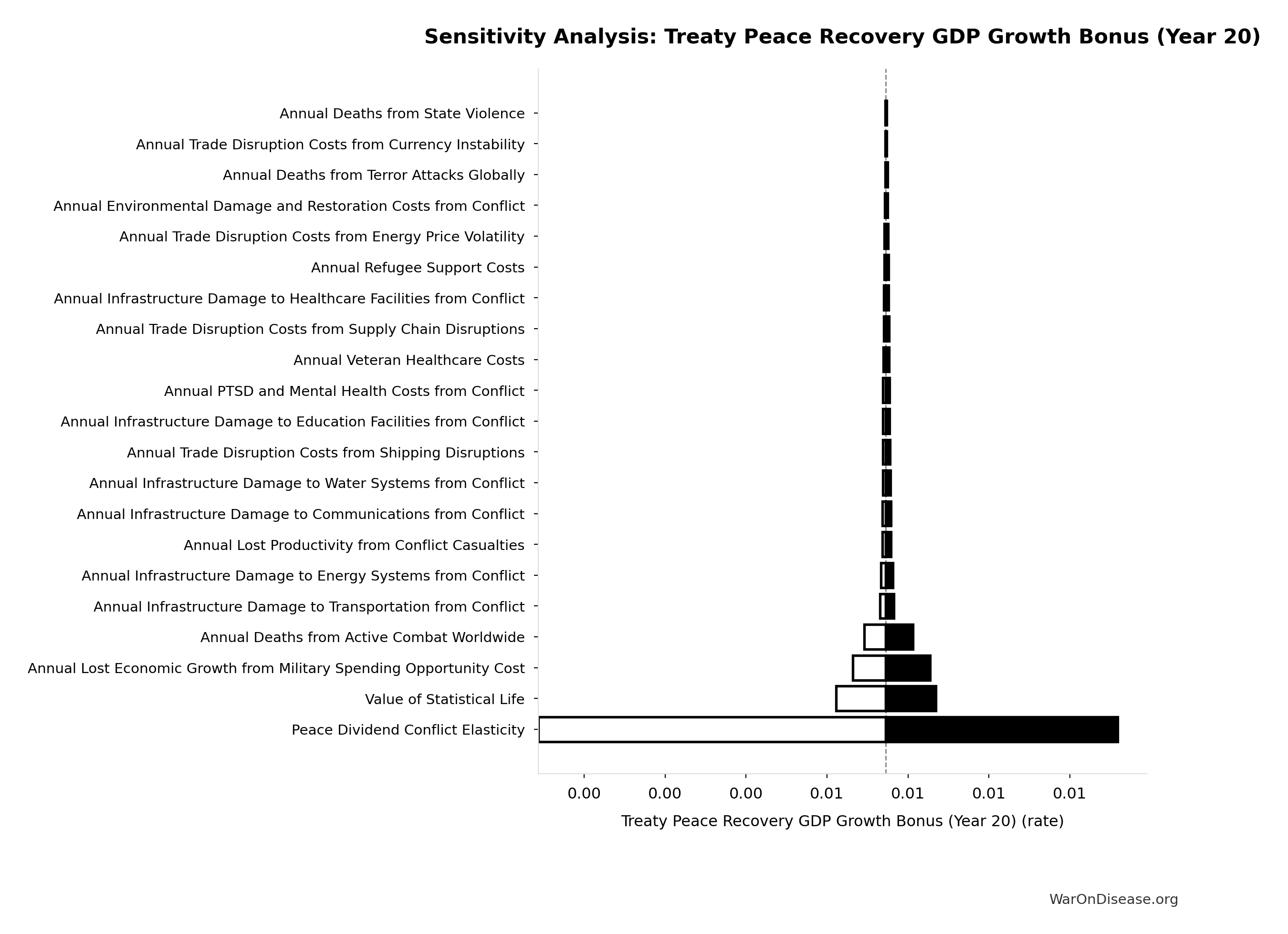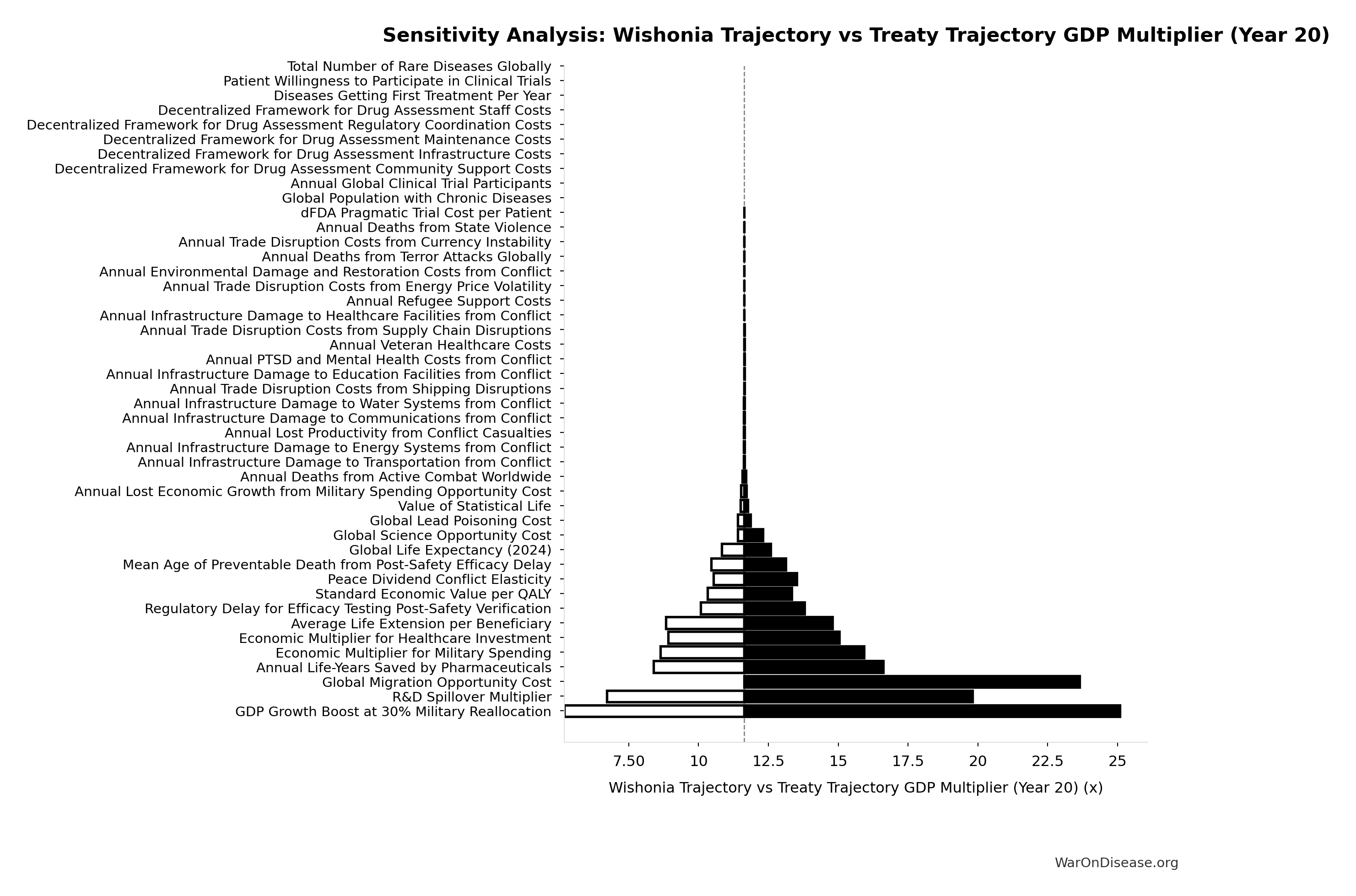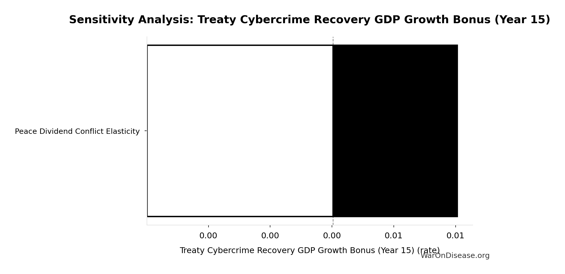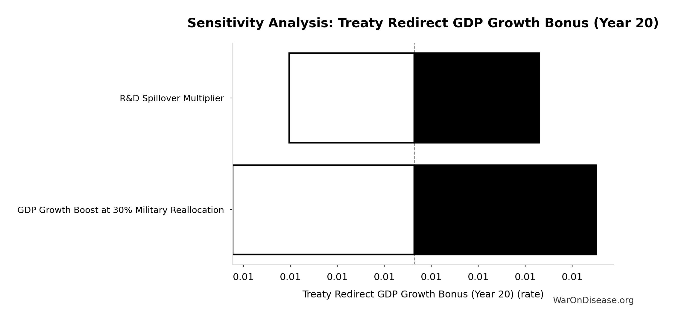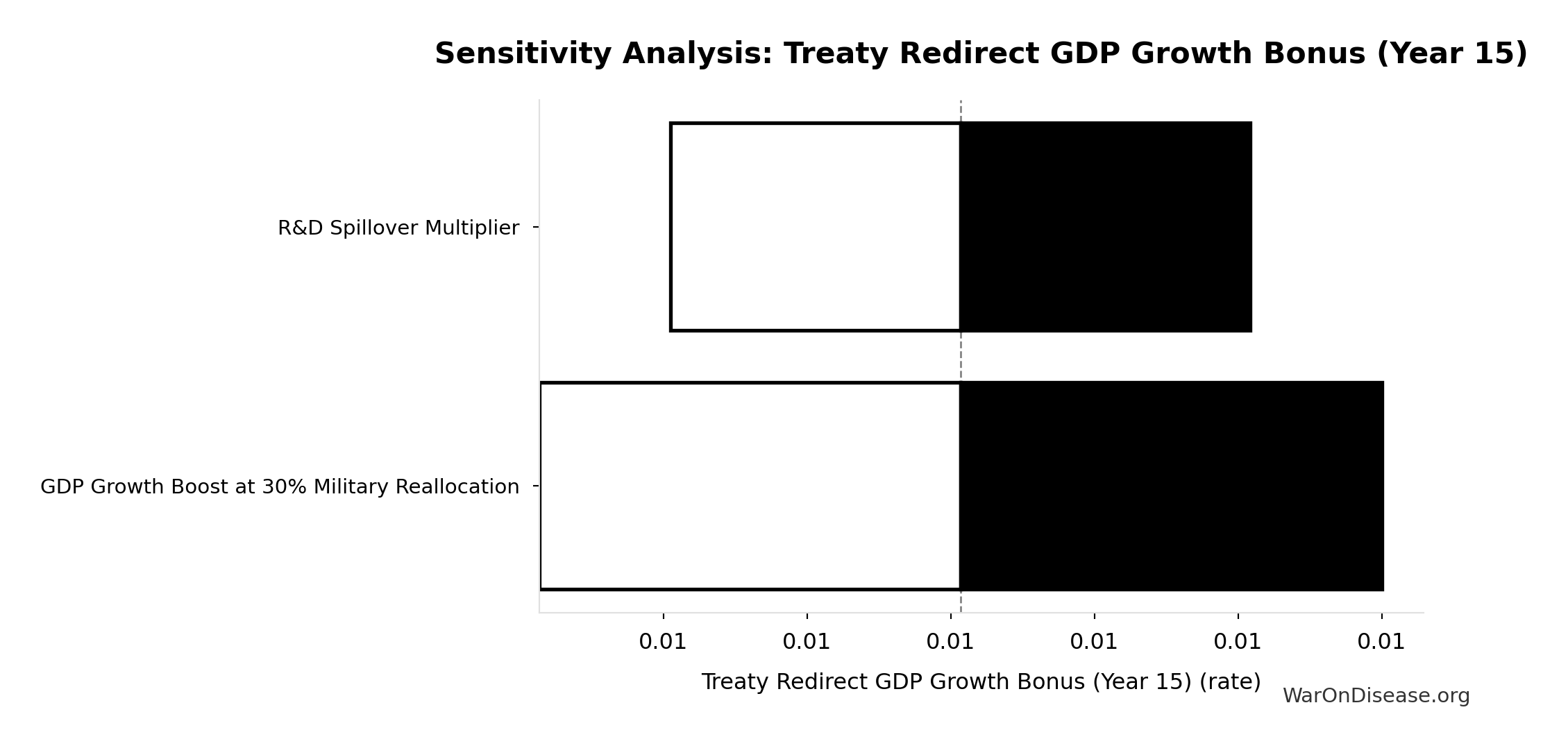 Conflict reduction elasticity: how much conflict costs decrease per 1% military spending cut. ε=0: no effect (spending cuts don’t reduce conflict). ε=0.5: moderate linkage (conservative). ε=1.0: proportional (baseline assumption). ε>1.0: shared enemy amplification (redirecting to disease creates unity).