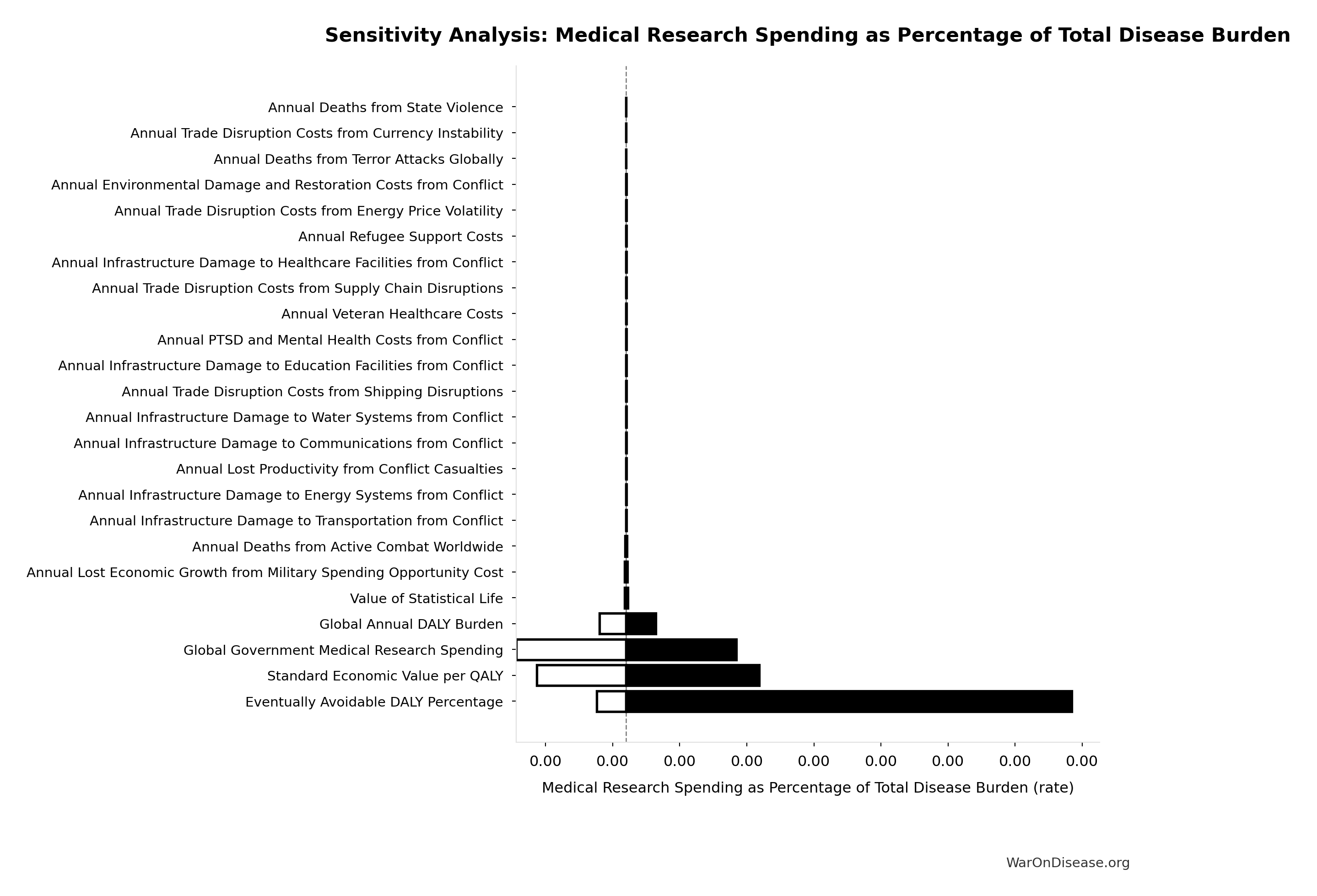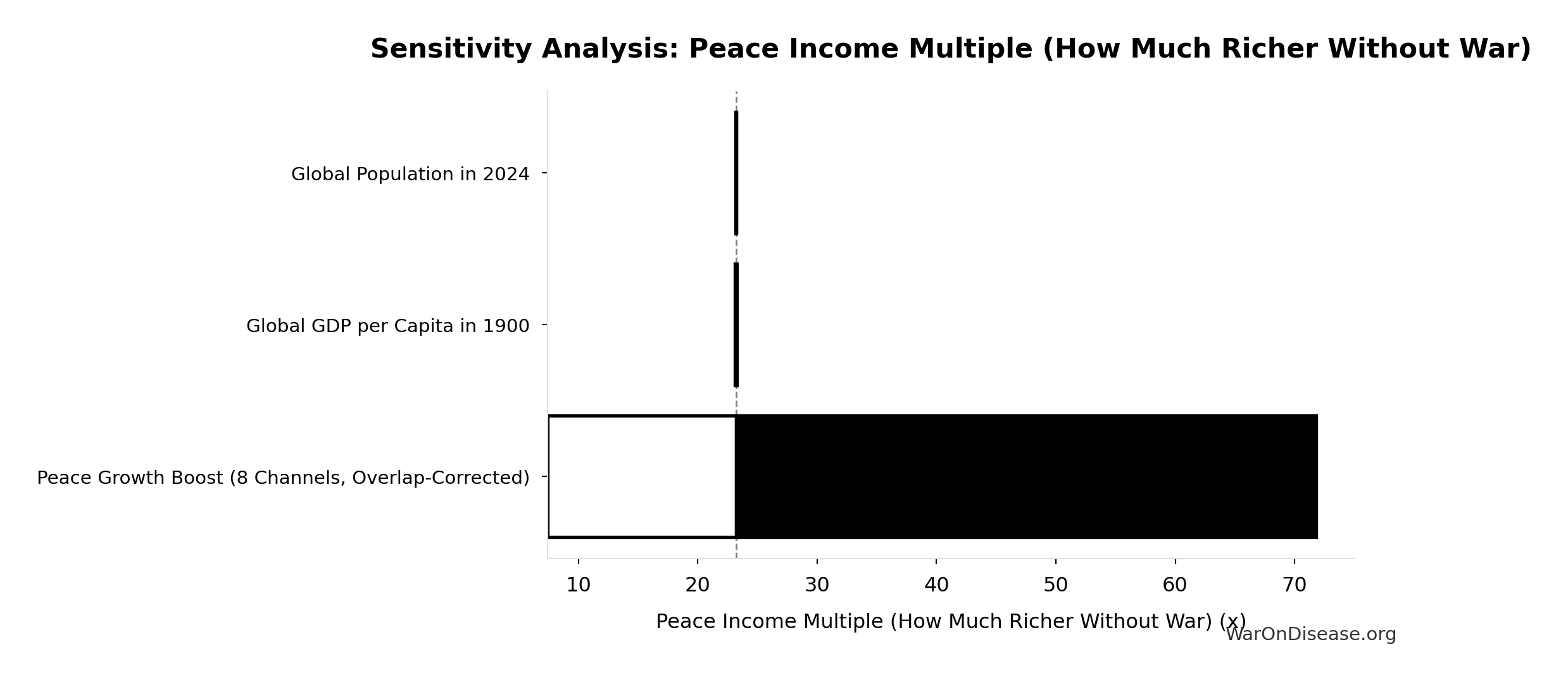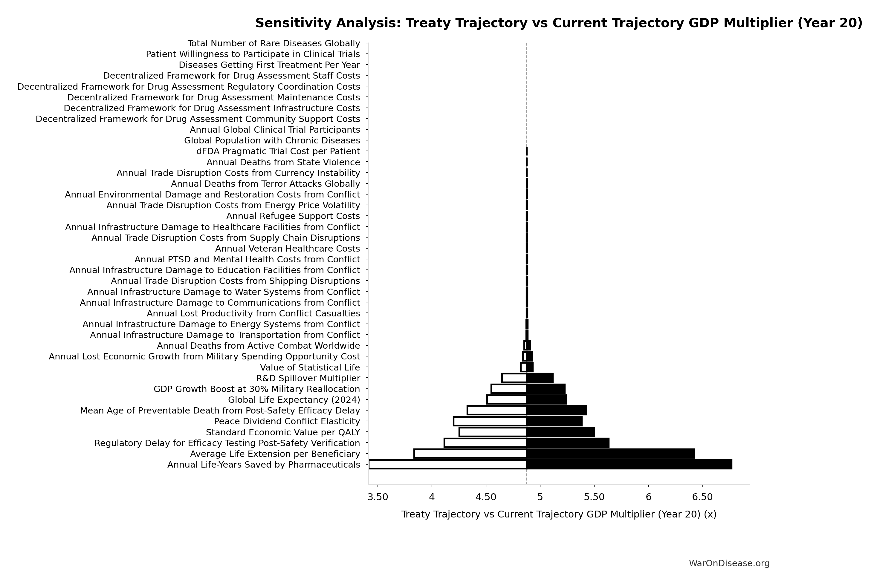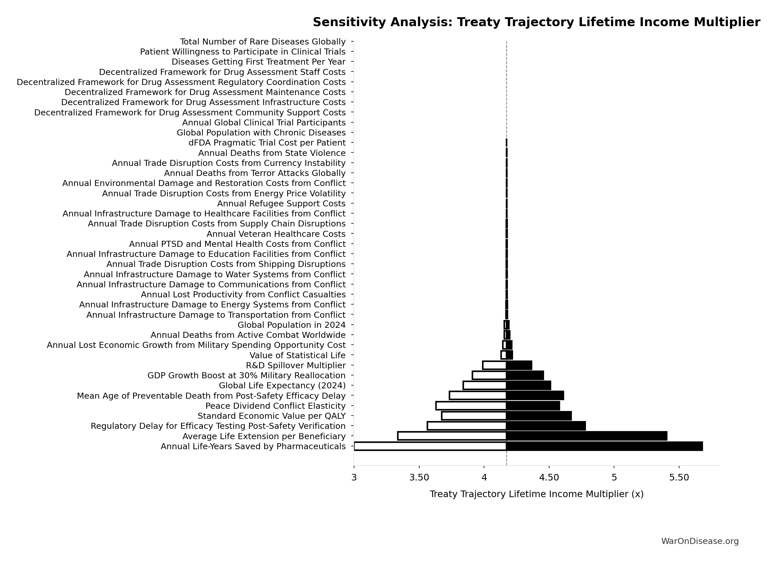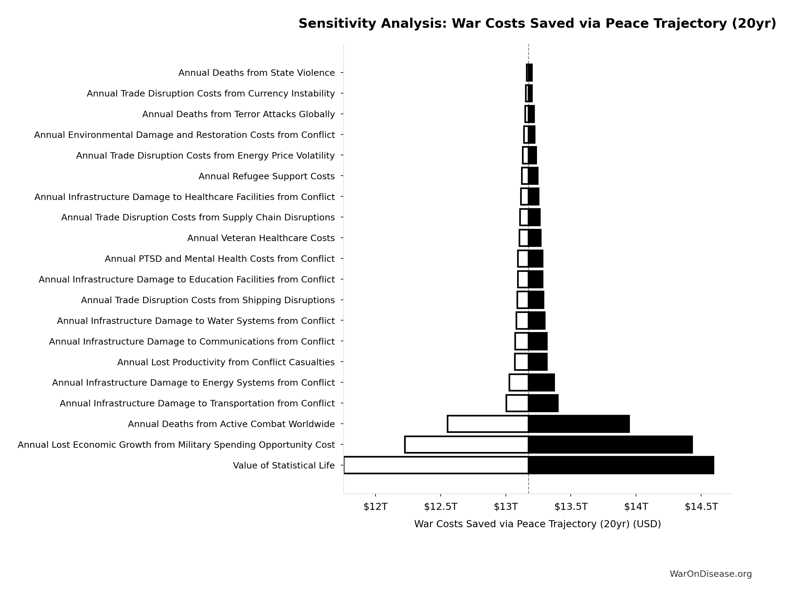 Conflict reduction elasticity: how much conflict costs decrease per 1% military spending cut. ε=0: no effect (spending cuts don’t reduce conflict). ε=0.5: moderate linkage (conservative). ε=1.0: proportional (baseline assumption). ε>1.0: shared enemy amplification (redirecting to disease creates unity).
