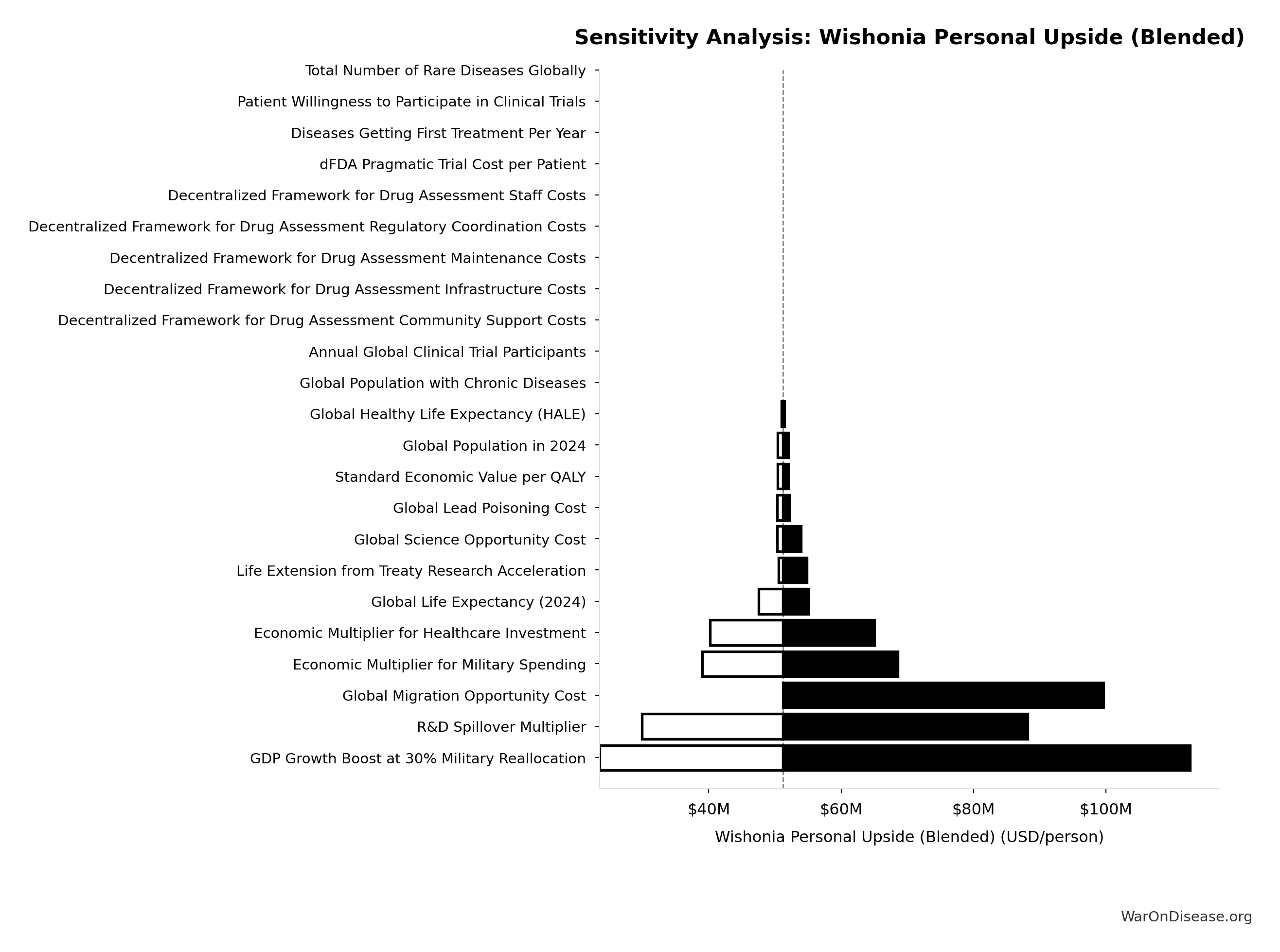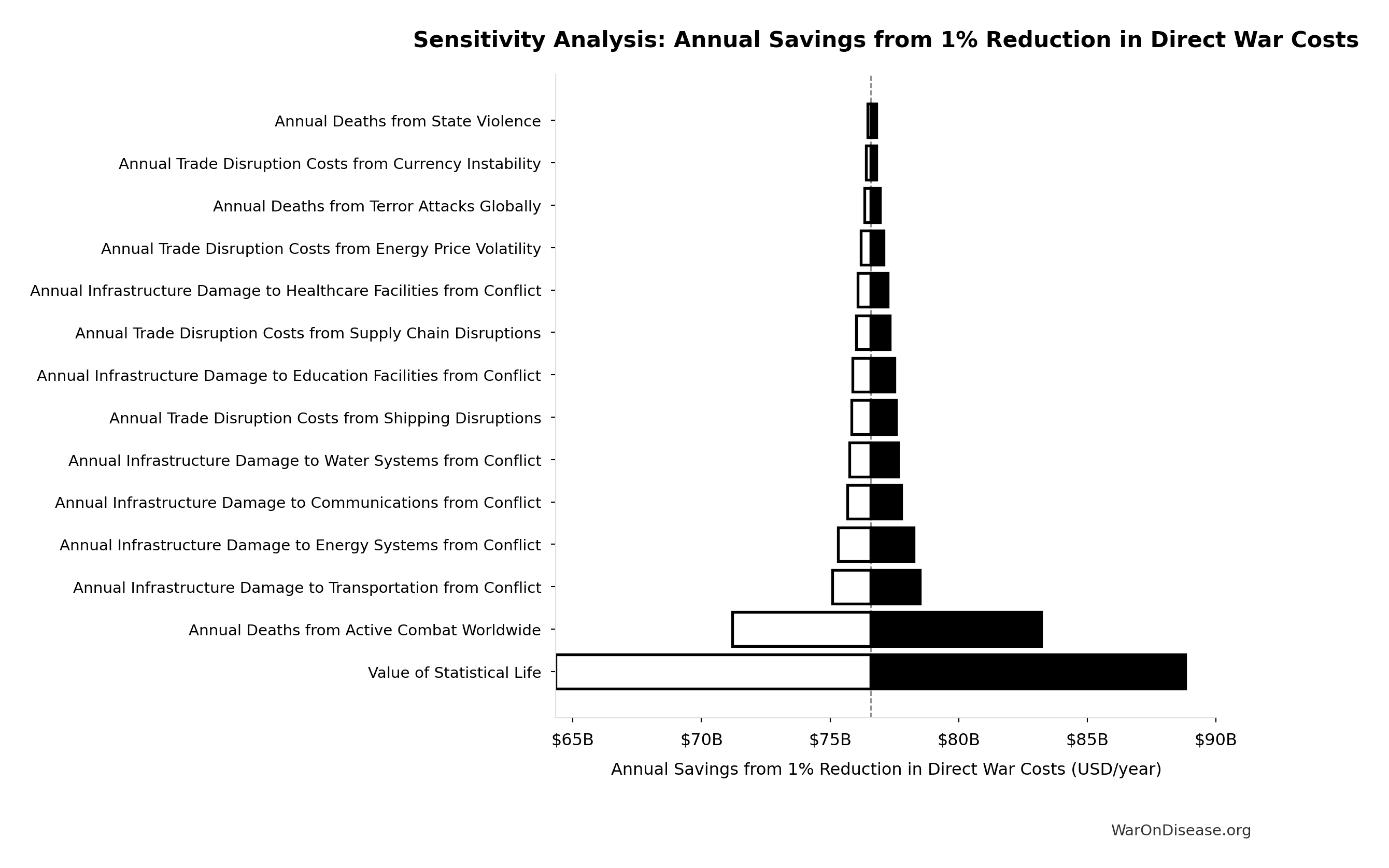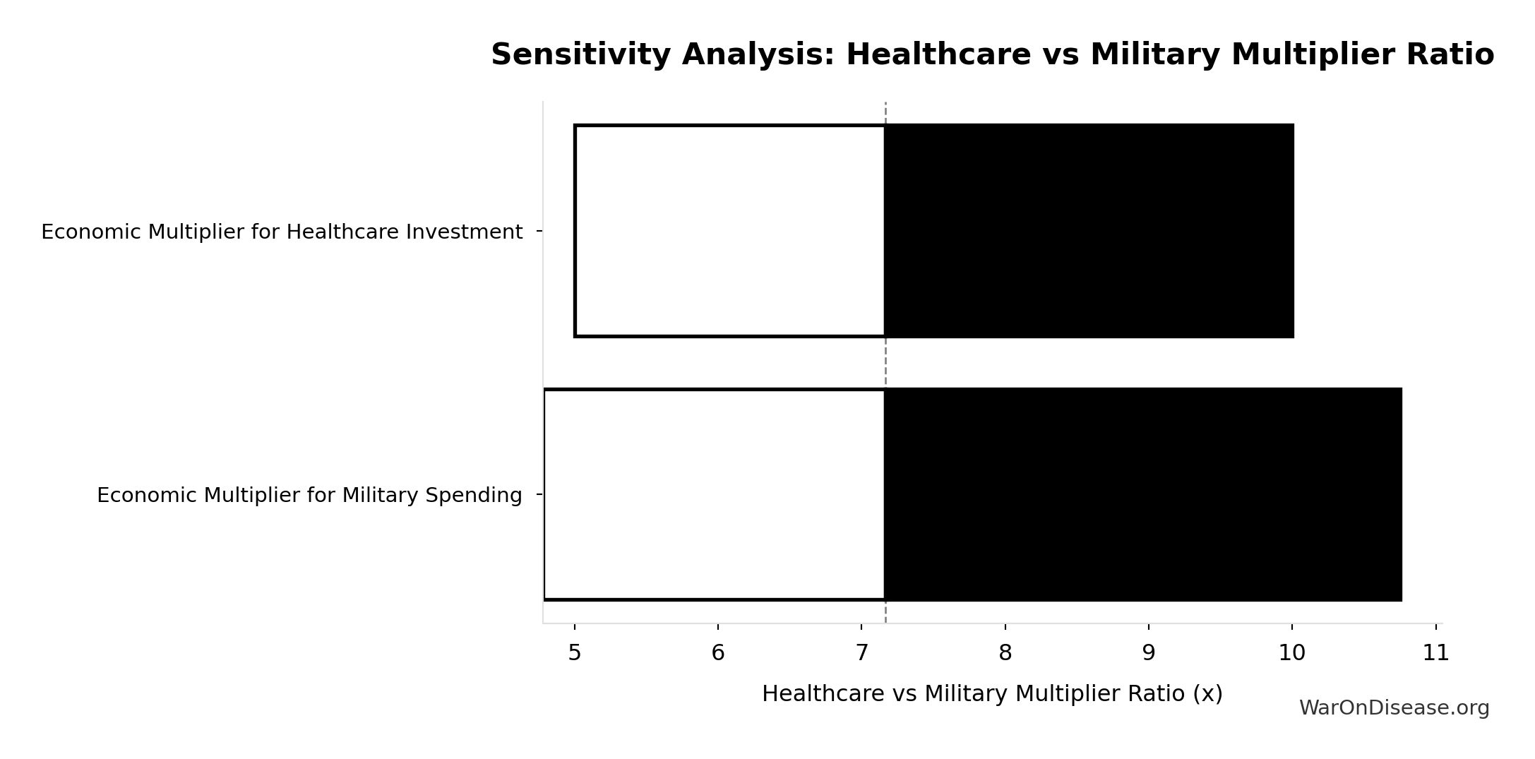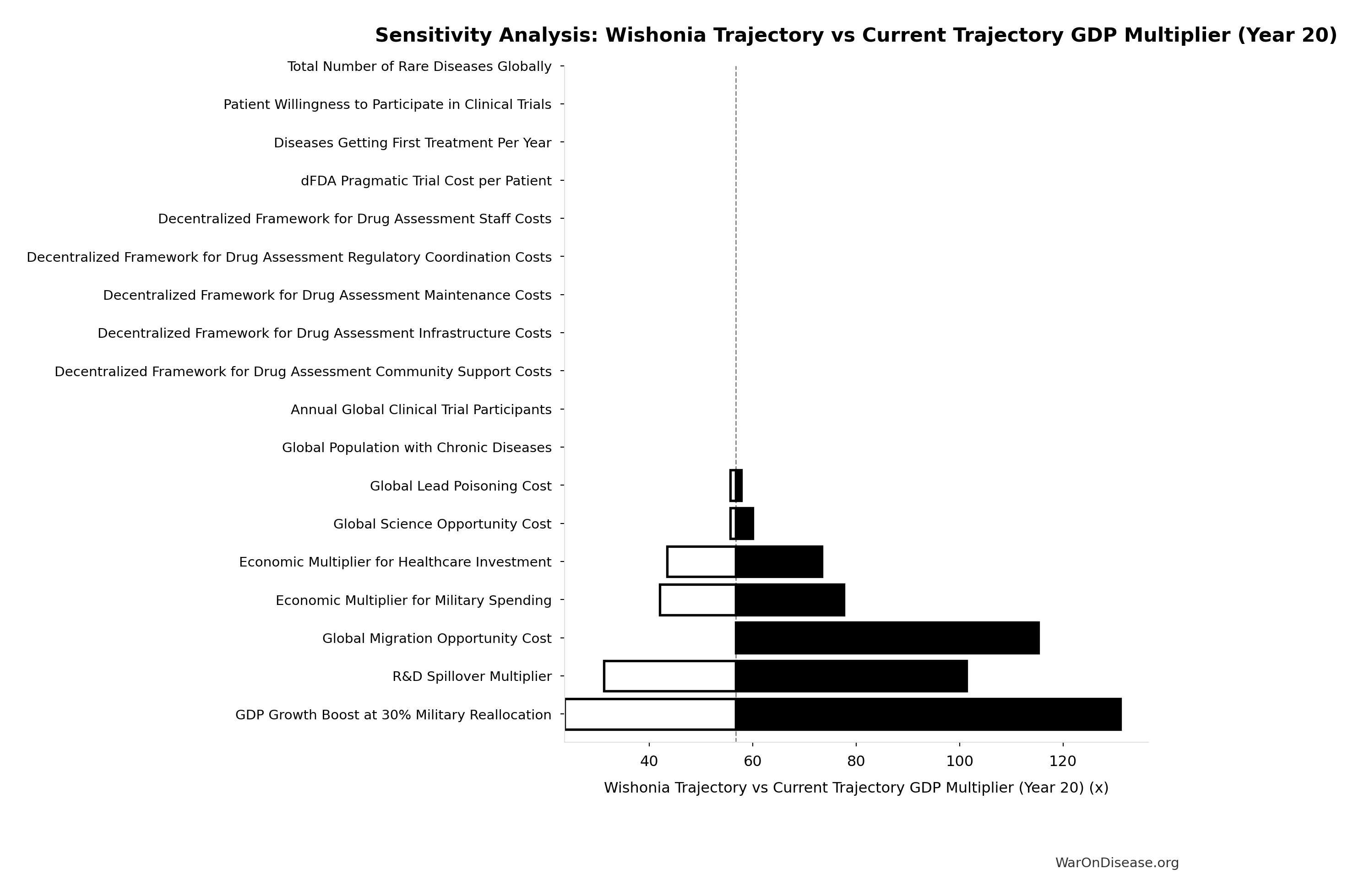 Conflict reduction elasticity: how much conflict costs decrease per 1% military spending cut. ε=0: no effect (spending cuts don’t reduce conflict). ε=0.5: moderate linkage (conservative). ε=1.0: proportional (baseline assumption). ε>1.0: shared enemy amplification (redirecting to disease creates unity).