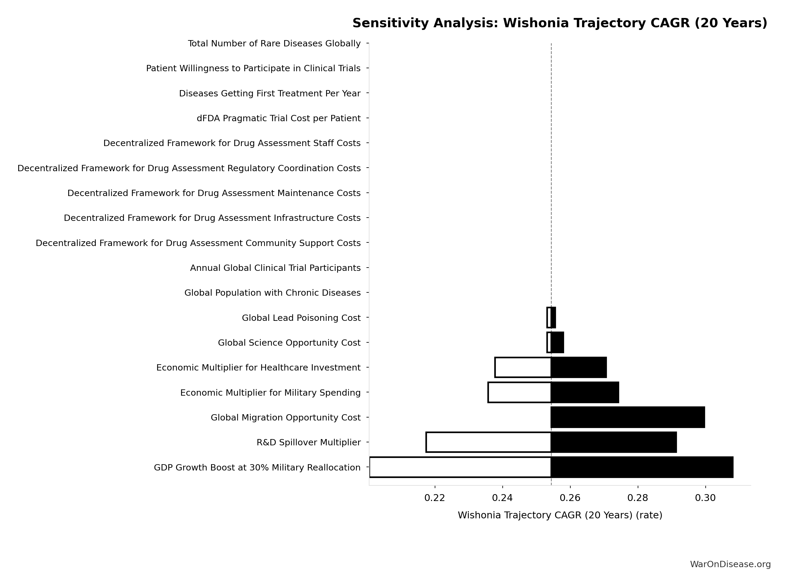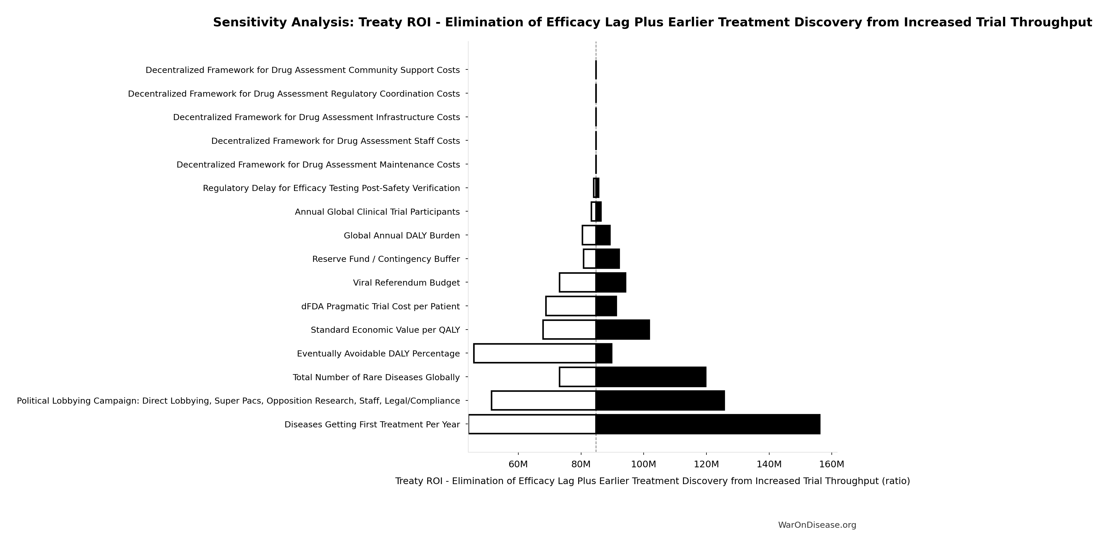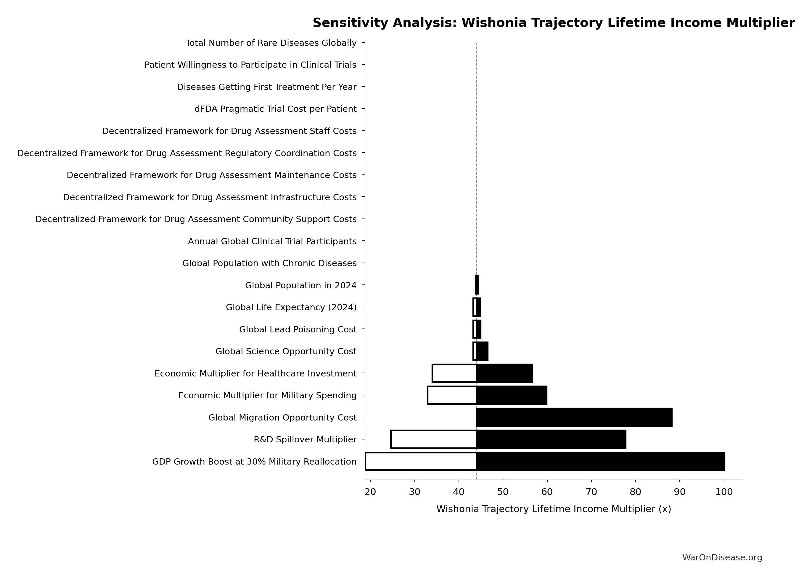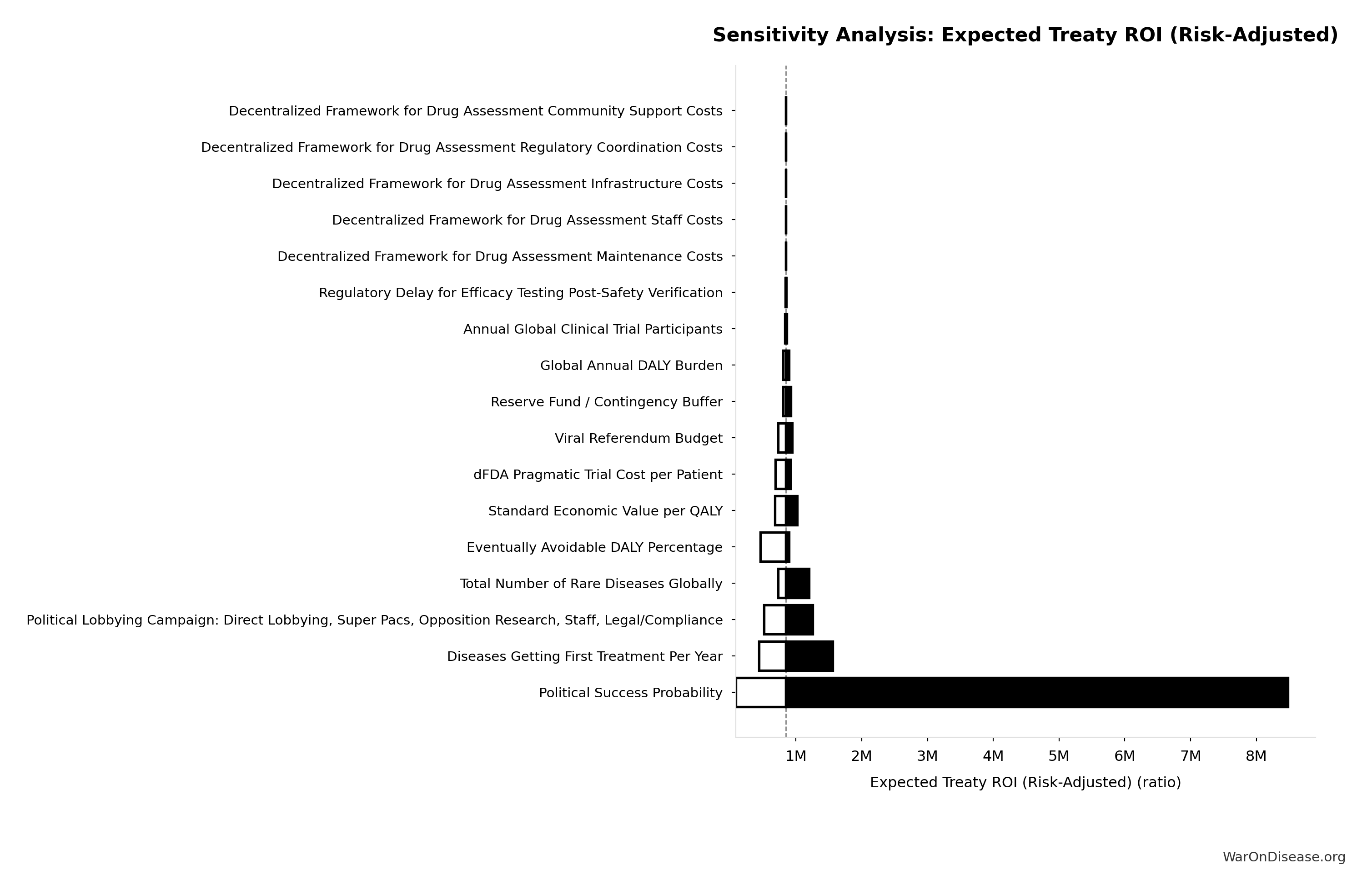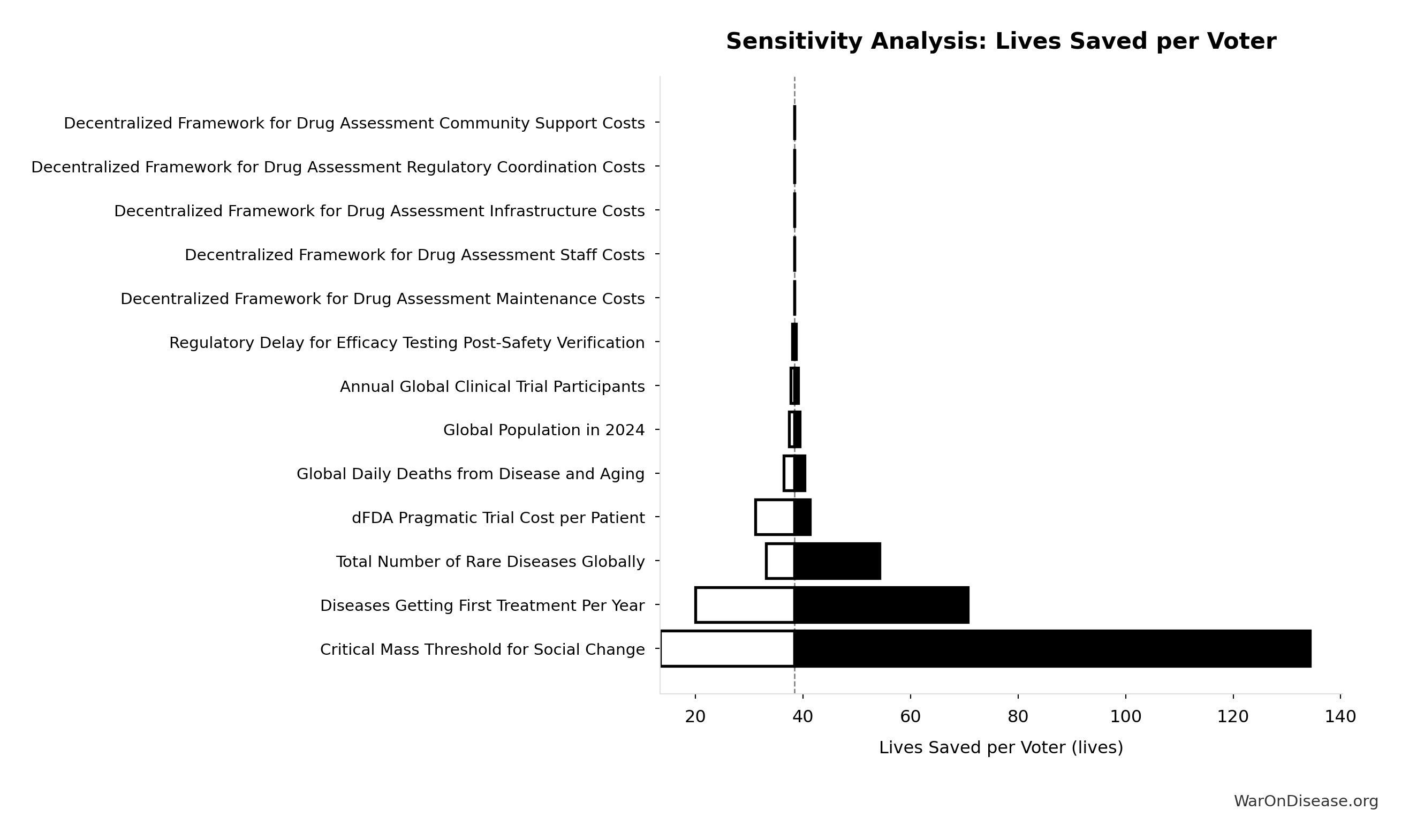 Conflict reduction elasticity: how much conflict costs decrease per 1% military spending cut. ε=0: no effect (spending cuts don’t reduce conflict). ε=0.5: moderate linkage (conservative). ε=1.0: proportional (baseline assumption). ε>1.0: shared enemy amplification (redirecting to disease creates unity).