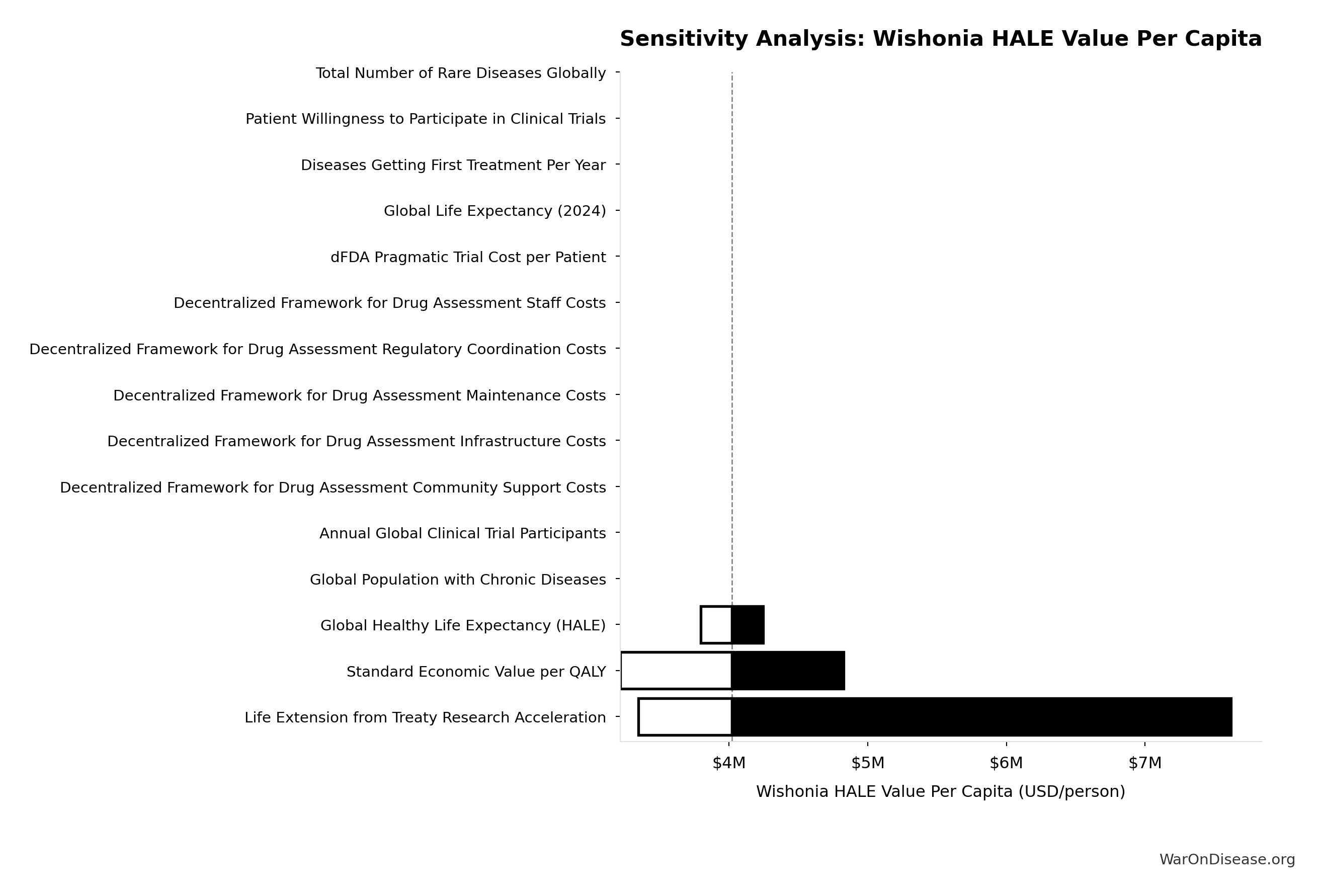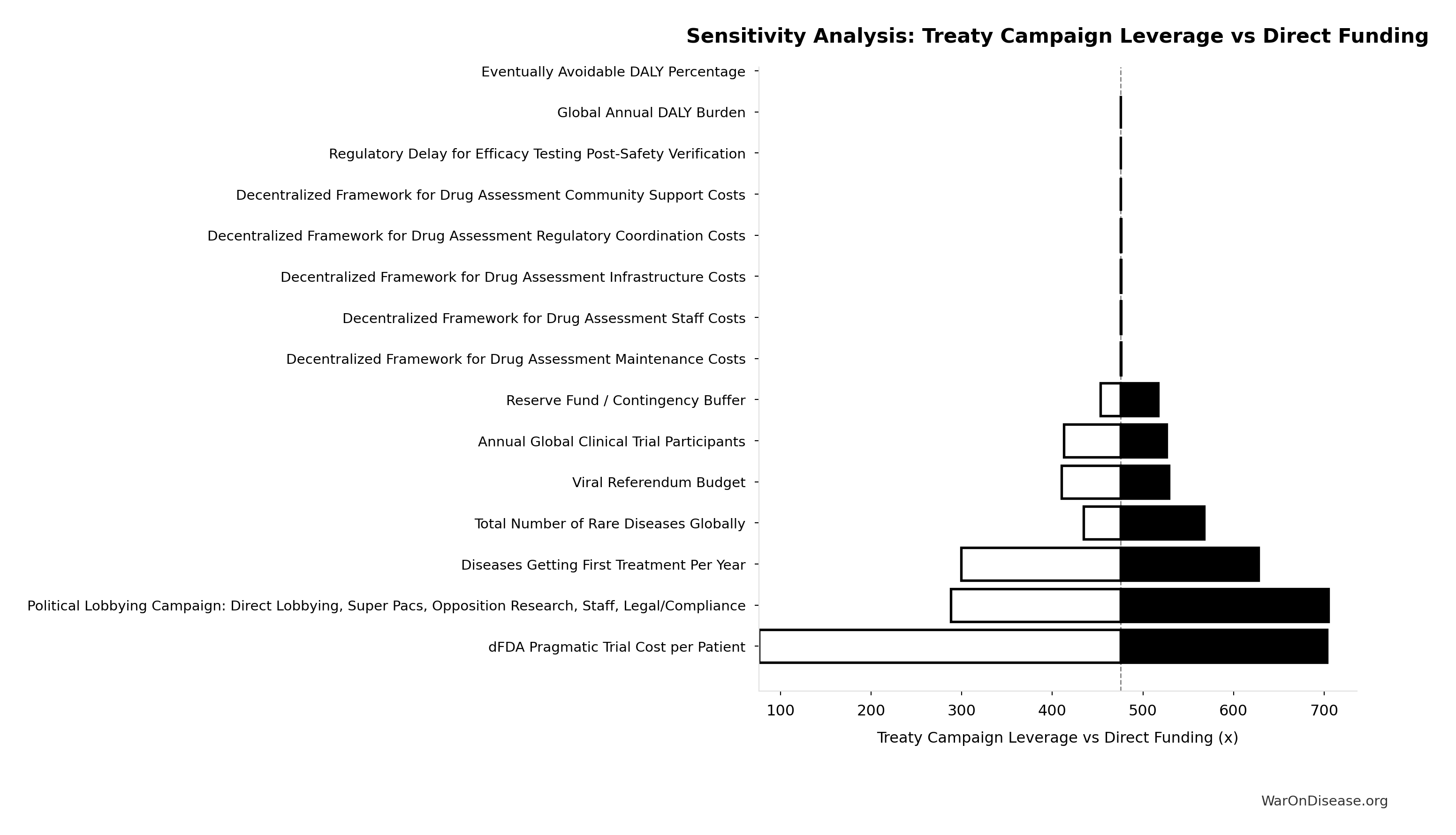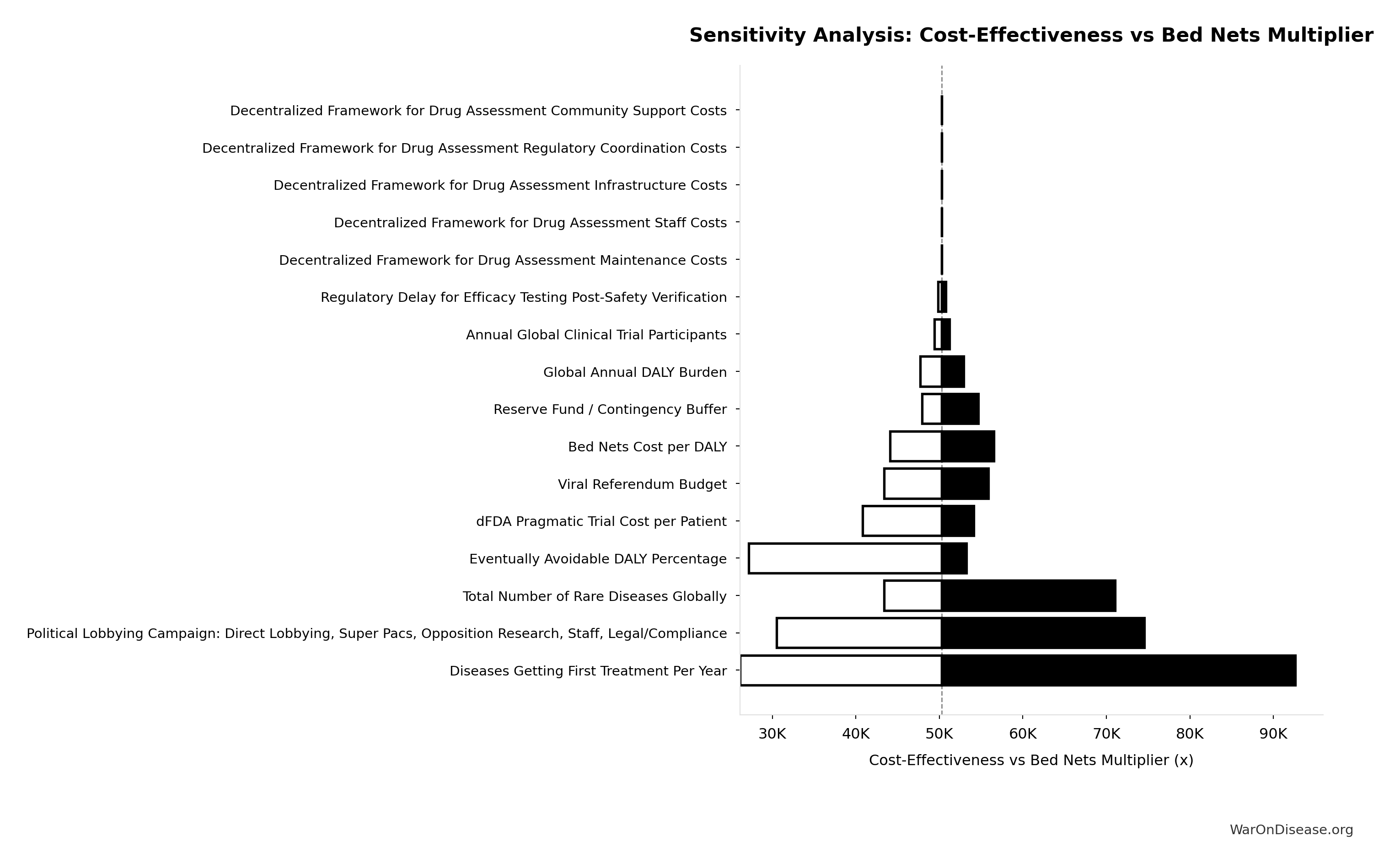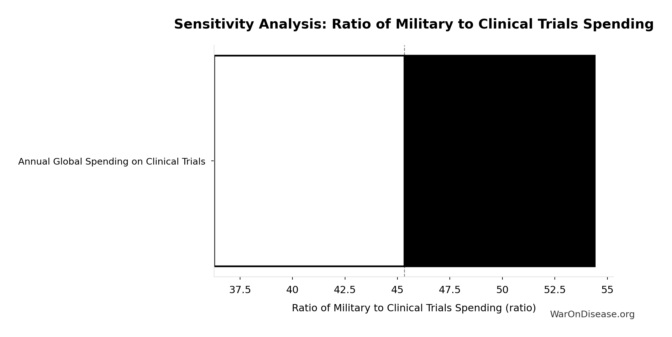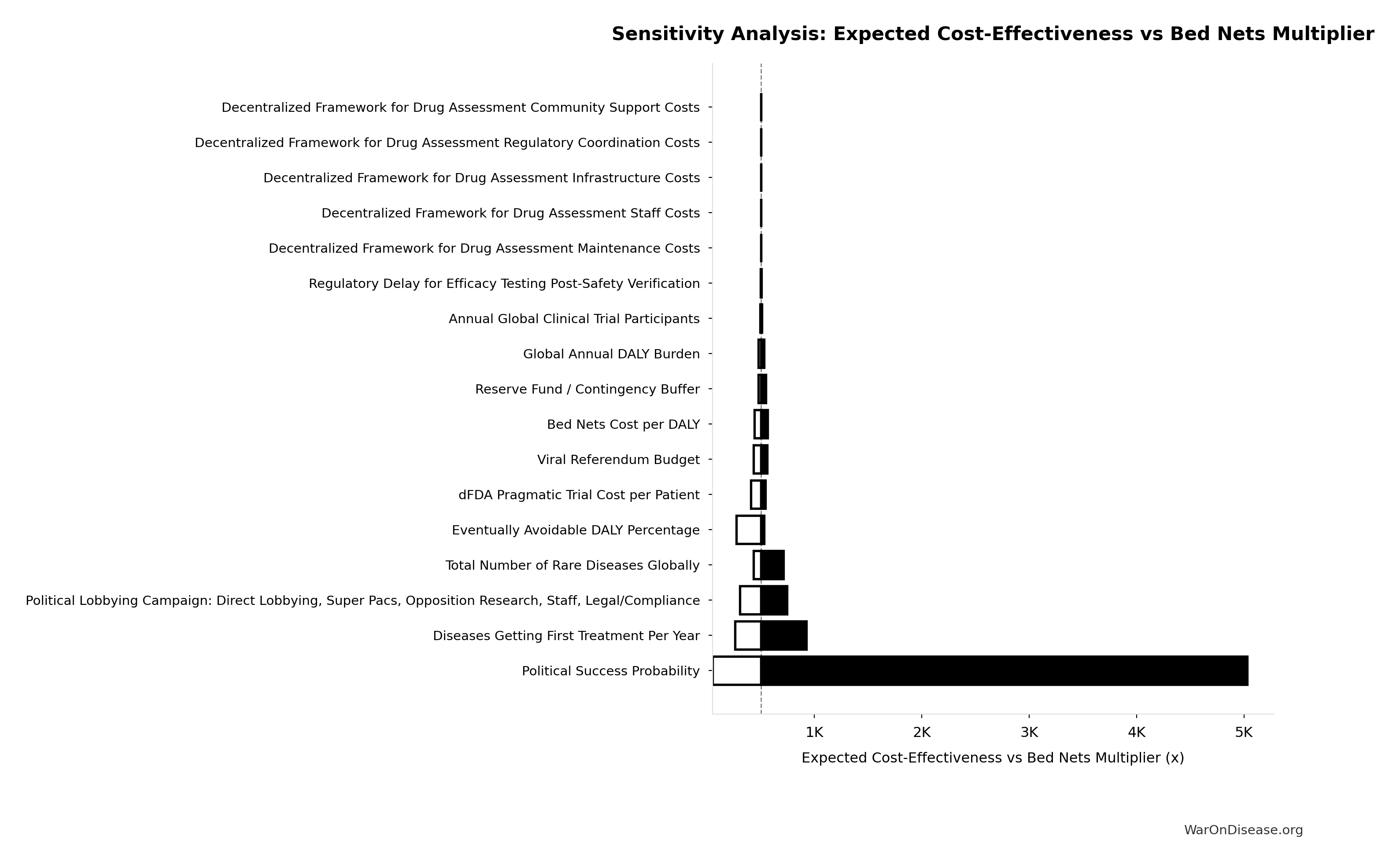 Conflict reduction elasticity: how much conflict costs decrease per 1% military spending cut. ε=0: no effect (spending cuts don’t reduce conflict). ε=0.5: moderate linkage (conservative). ε=1.0: proportional (baseline assumption). ε>1.0: shared enemy amplification (redirecting to disease creates unity).