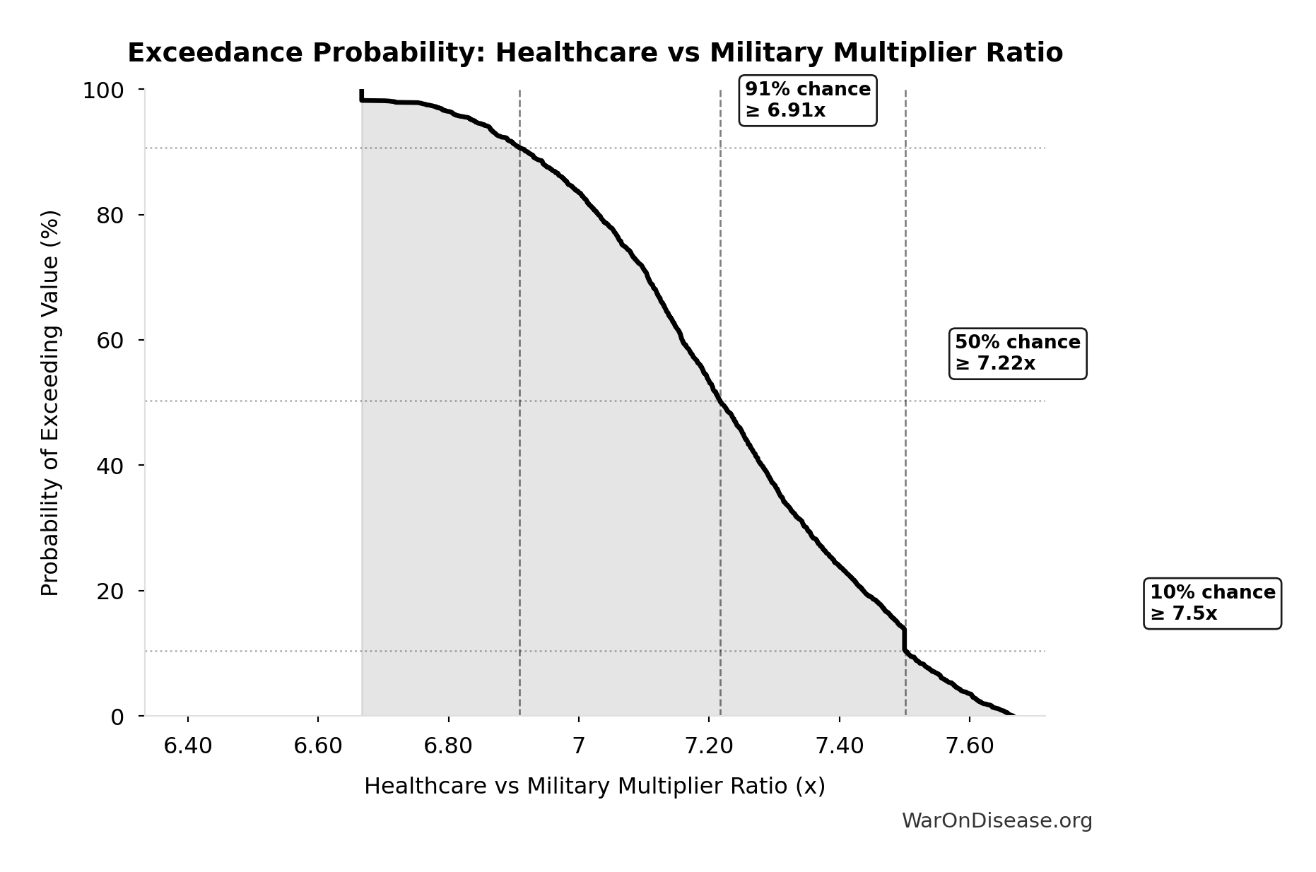 This exceedance probability chart shows the likelihood that Bullets Purchasable Per Person Per Year will exceed any given threshold. Higher curves indicate more favorable outcomes with greater certainty.