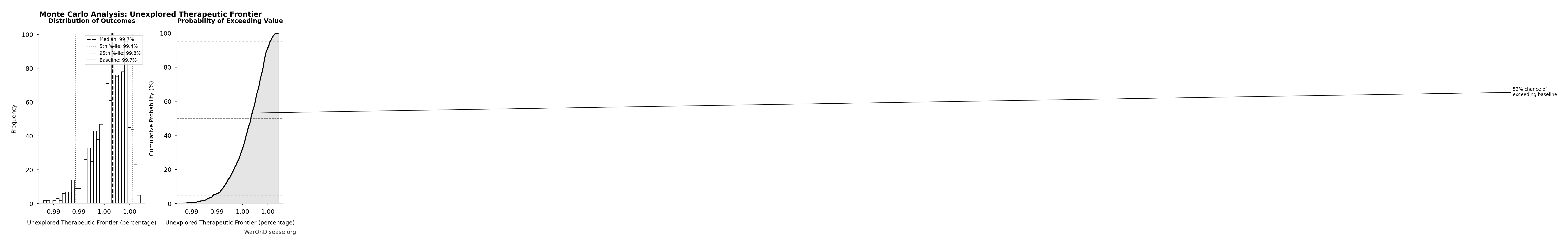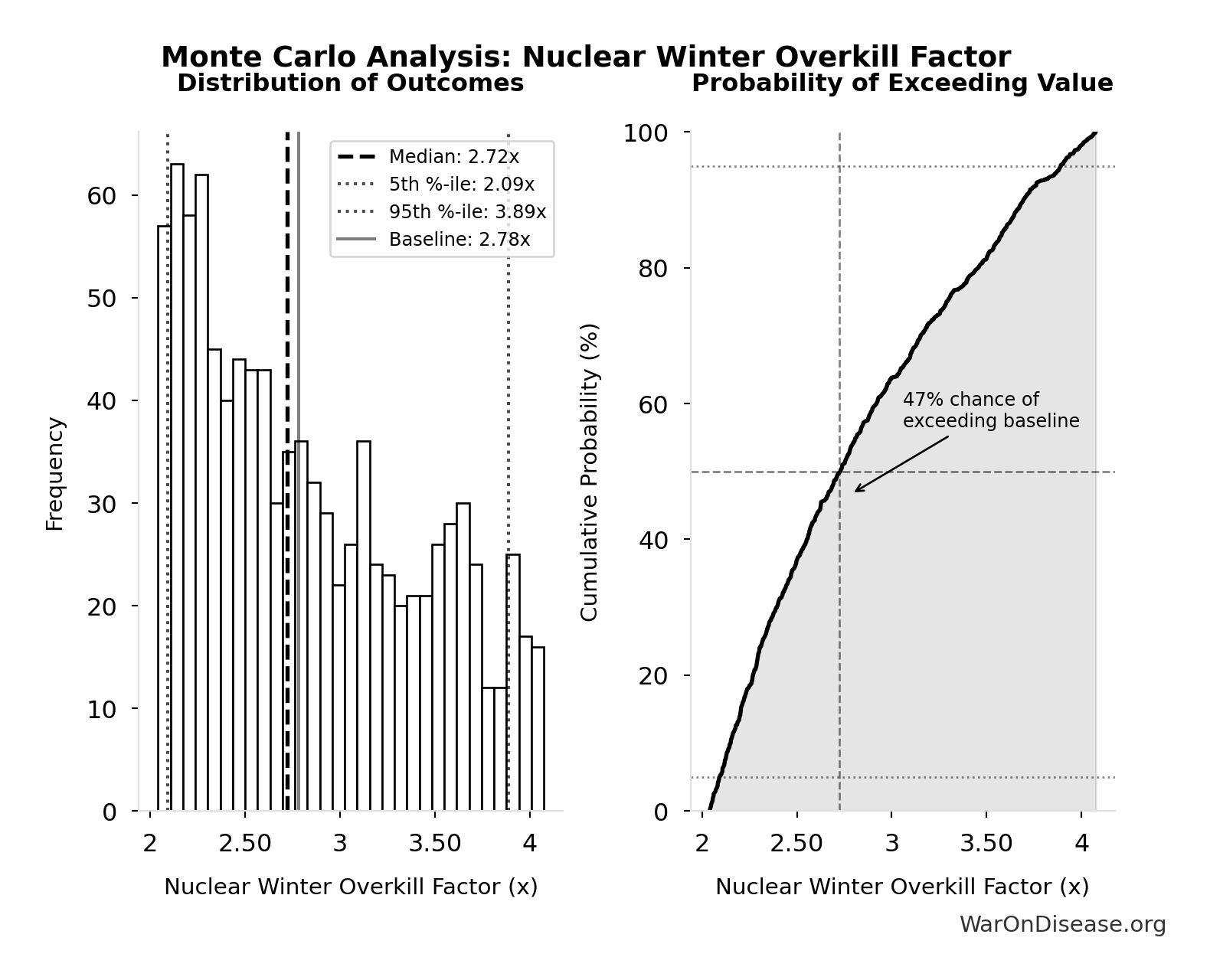 The histogram shows the distribution of Apocalypse Markup across 10,000 Monte Carlo simulations. The CDF (right) shows the probability of the outcome exceeding any given value, which is useful for risk assessment.