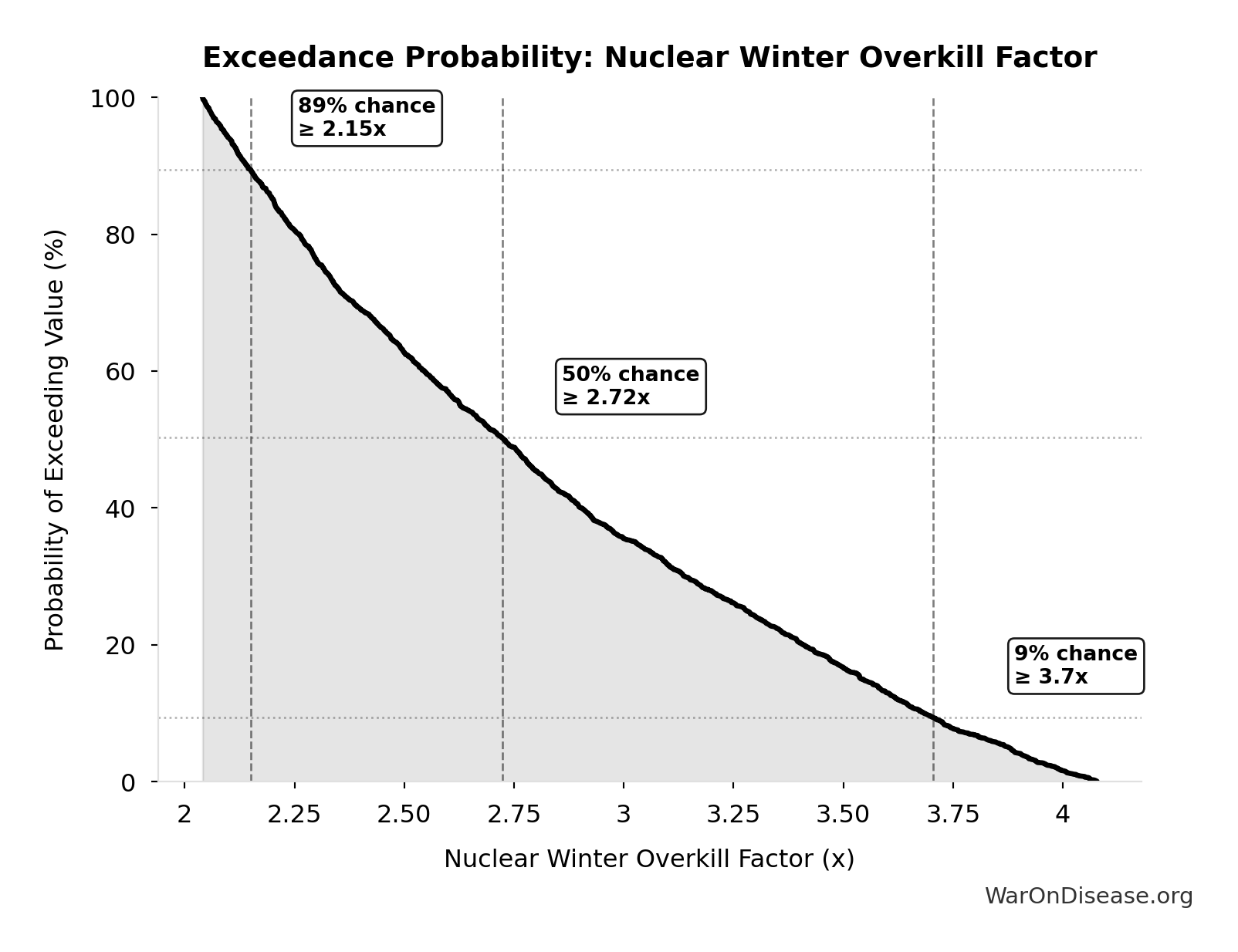 \[ \begin{gathered} M_{apocalypse} \\ = Spending_{mil} - P_{apocalypse} \\ = \$2.72T - \$33.1B \\ = \$2.69T \end{gathered} \] where: \[ \begin{gathered} P_{apocalypse} \\ = \frac{S_{nuke}}{Overkill_{winter}} \\ = \frac{\$92B}{2.78} \\ = \$33.1B \end{gathered} \] where: \[ \begin{gathered} Overkill_{winter} \\ = \frac{W_{global}}{W_{winter}} \\ = \frac{12{,}200}{4{,}400} \\ = 2.78 \end{gathered} \] ~ Medium confidence