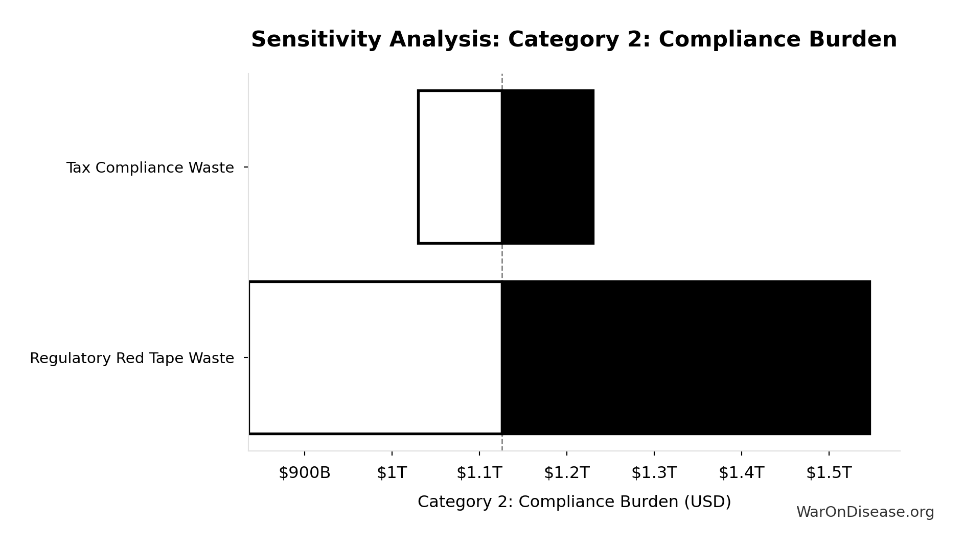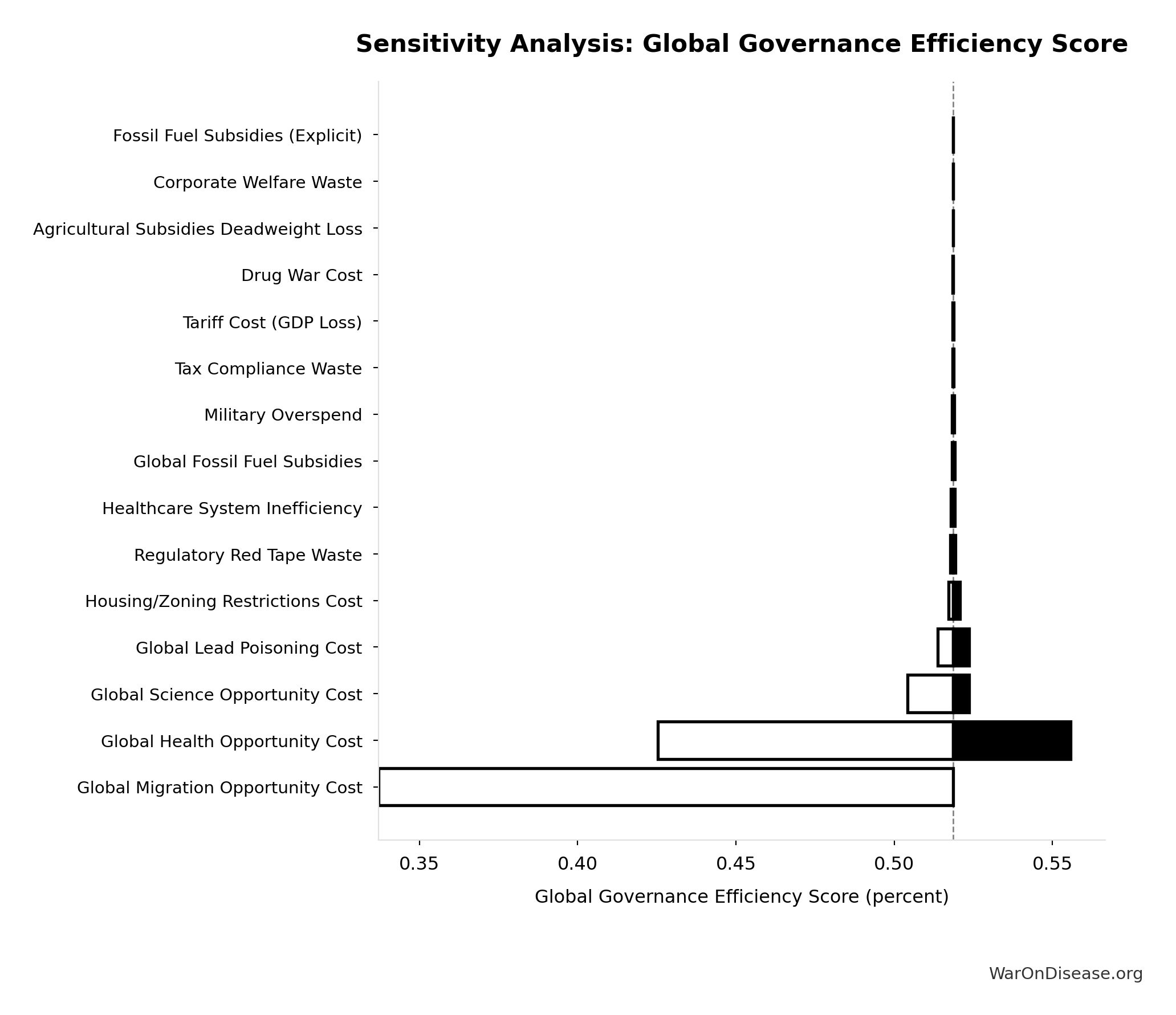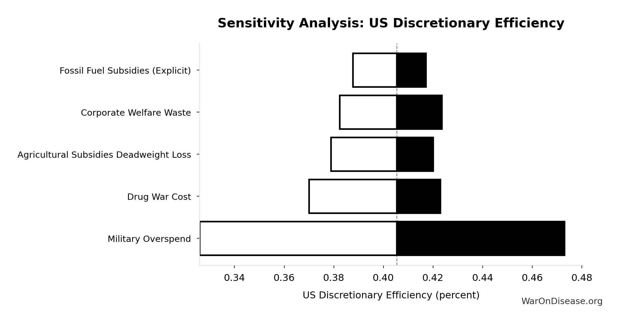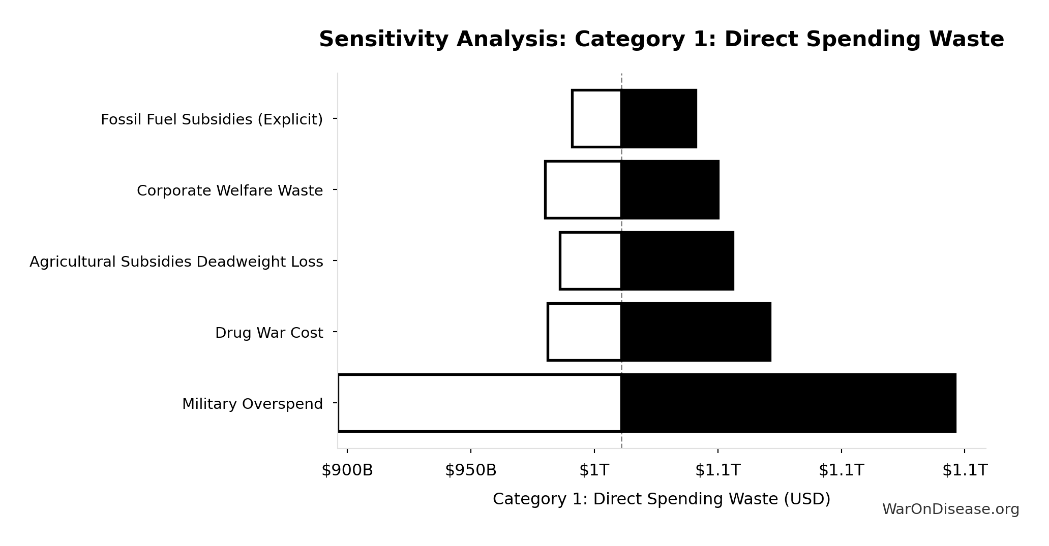 Overlap discount factor between US government waste categories. Set to 1.0 (no discount). Categories are treated as additive, recognizing that any overlap is offset by excluded categories (state/local inefficiency, implicit subsidies, behavioral effects).