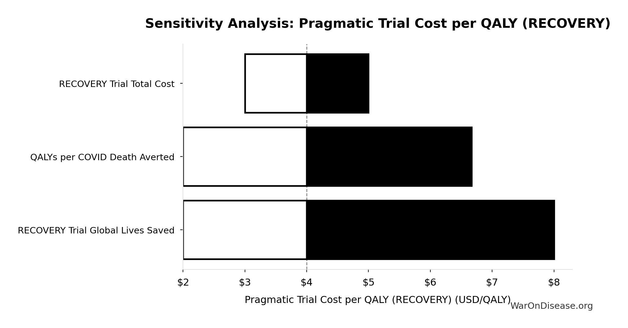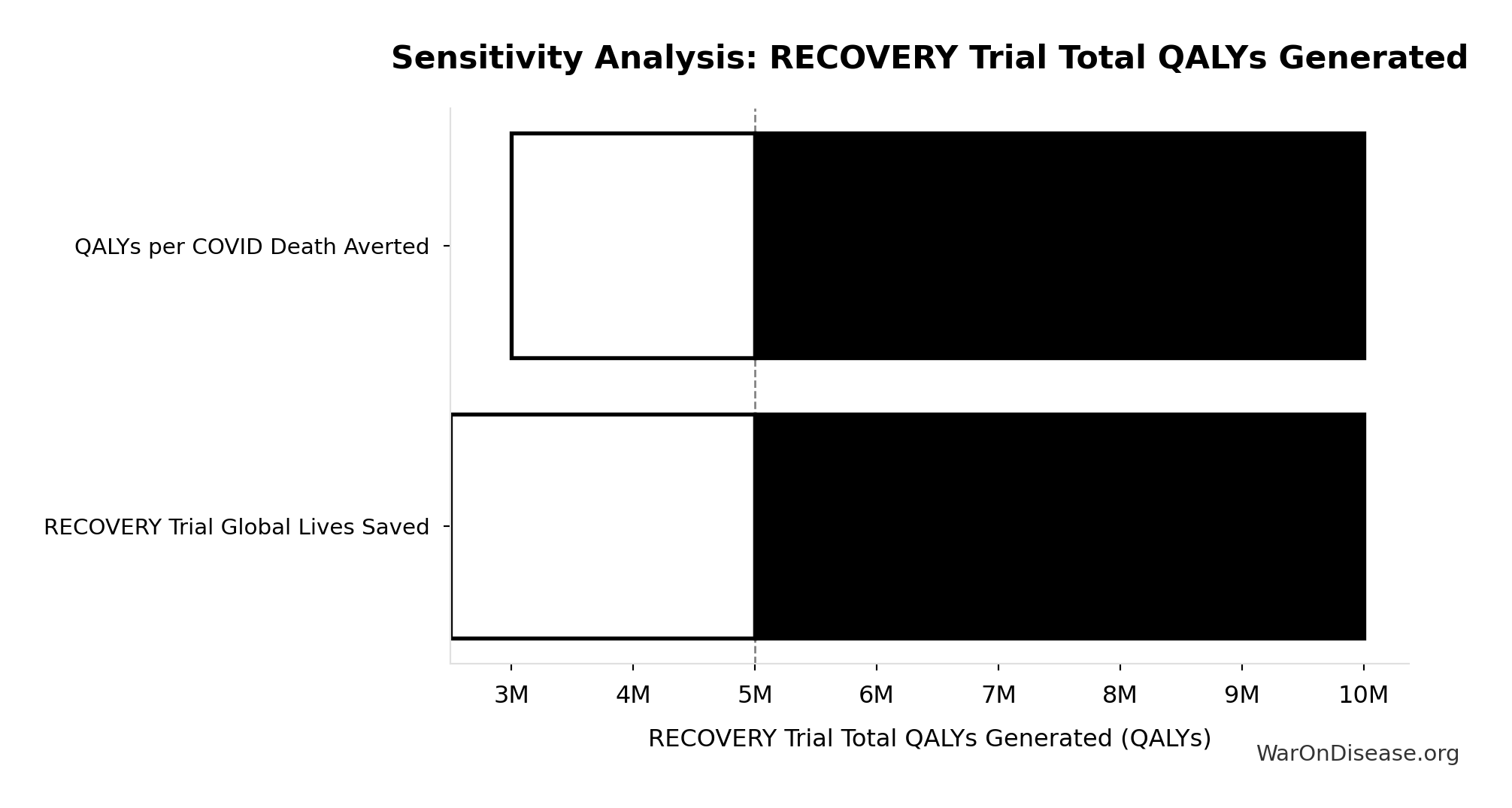Technical: 95% CI: [3 QALYs/death, 10 QALYs/death] • Distribution: Lognormal