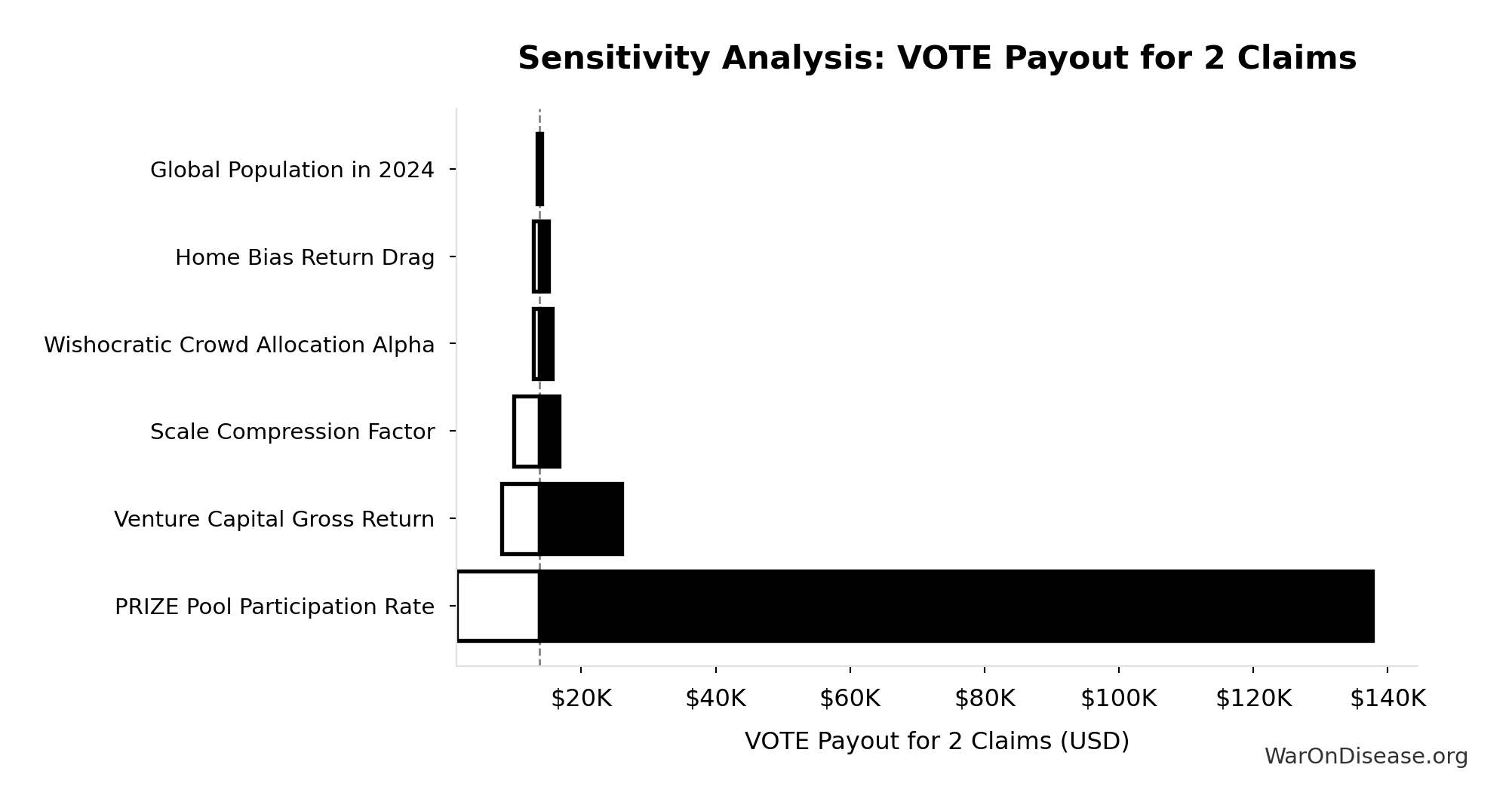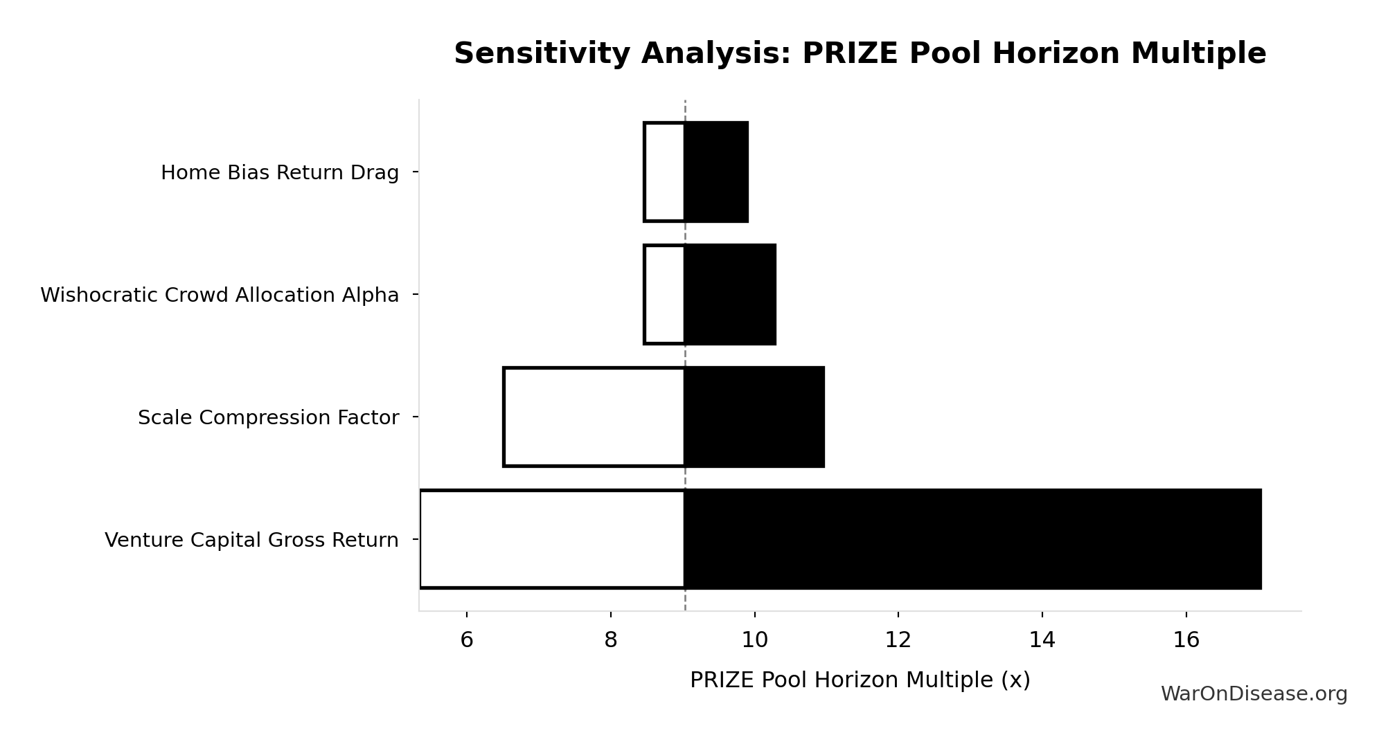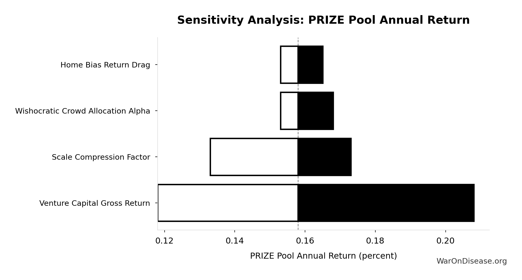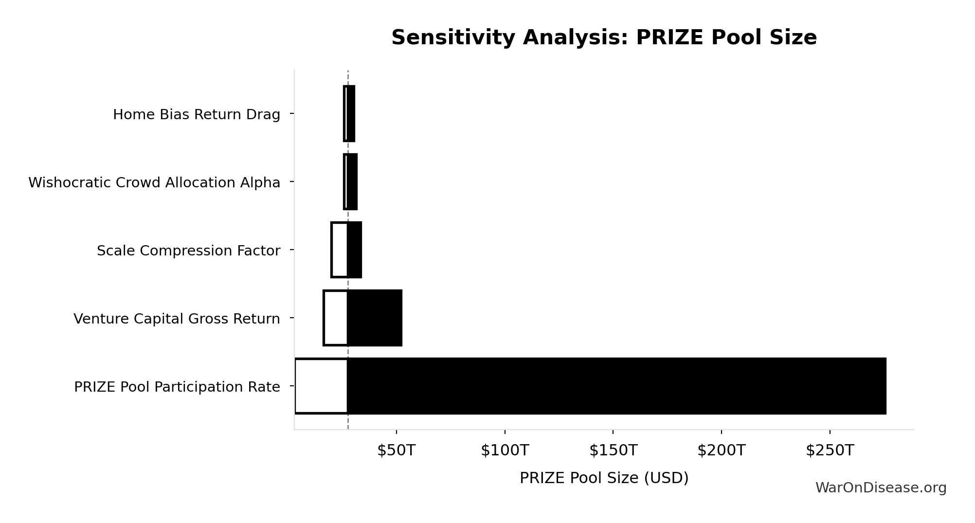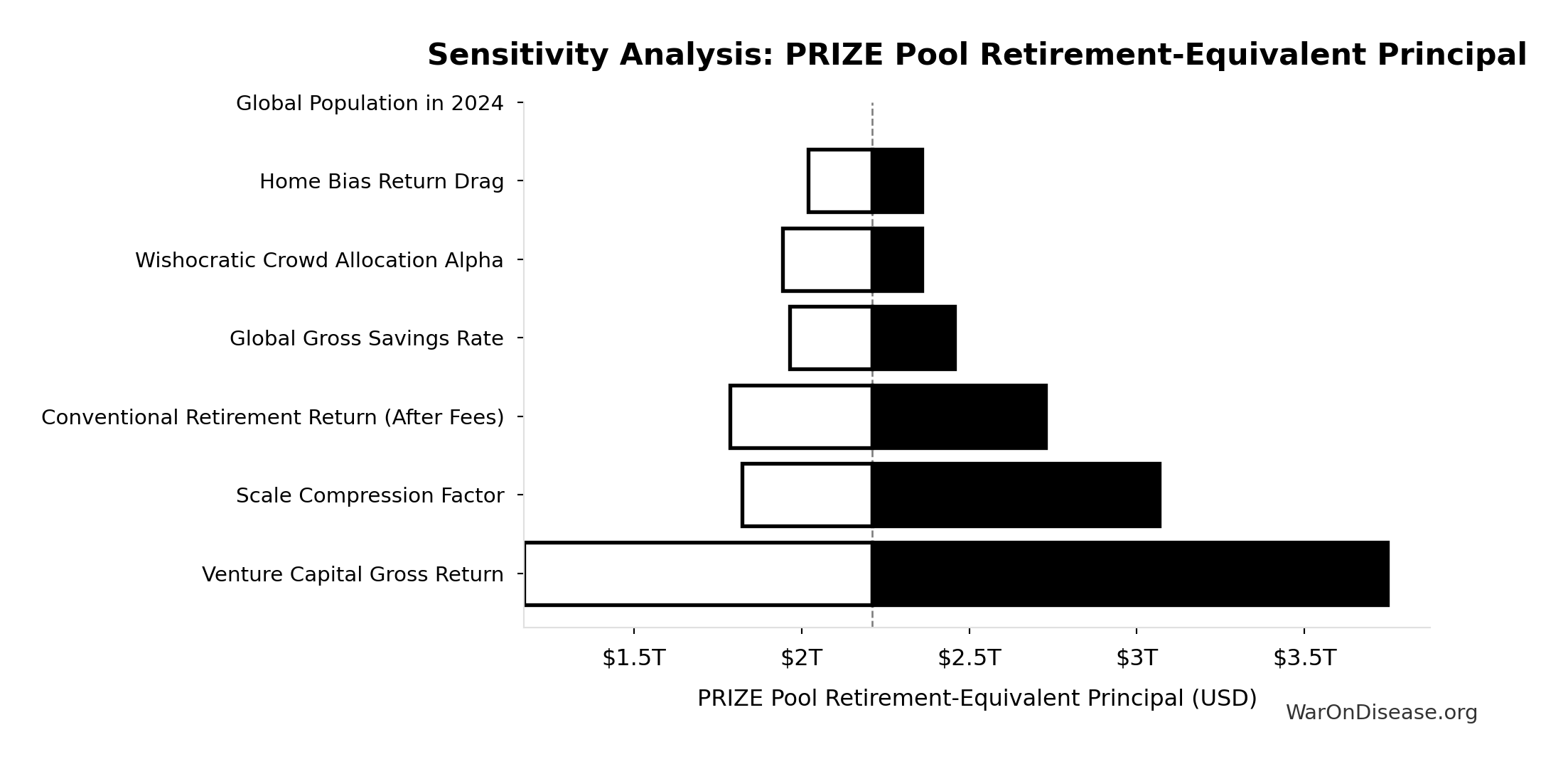 Diminishing-returns drag as the venture market expands ~15x (current global VC ~$300B/yr; Prize Fund deploys ~$4.7T/yr). More capital chasing deals compresses returns. Partially offset by market expansion (every viable idea gets funded, oligopolies face real competition). Point estimate is moderate; CI spans optimistic to pessimistic.