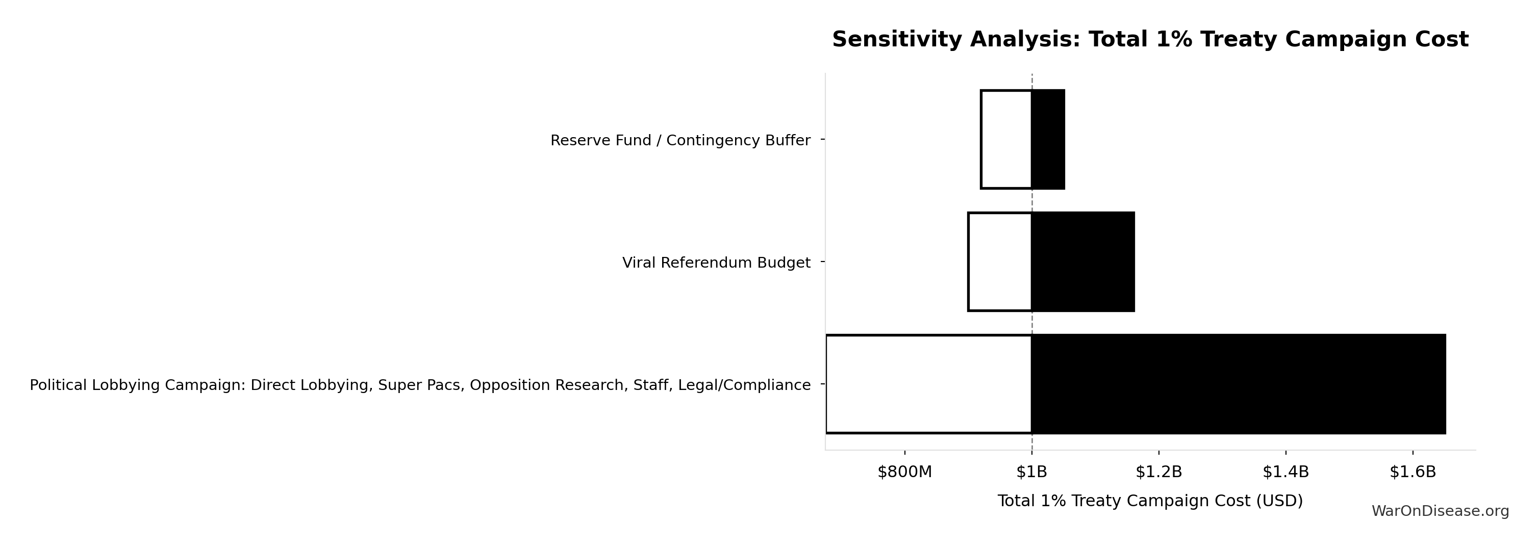 Reserve fund / contingency buffer (10% of total campaign cost). Using industry standard 10% for complex campaigns with potential for unforeseen legal challenges, opposition response, or regulatory delays. Conservative lower bound of $20M (2%) reflects transparent budget allocation and predictable referendum/lobbying costs.
