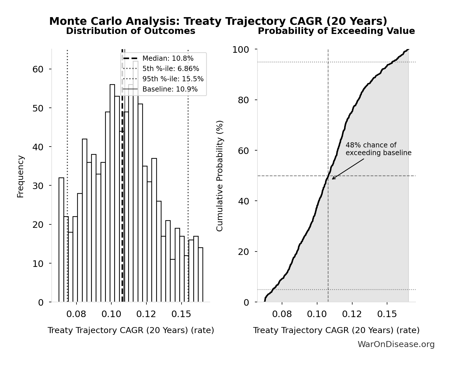 The histogram shows the distribution of Best-Practice Life Expectancy Gain across 10,000 Monte Carlo simulations. The CDF (right) shows the probability of the outcome exceeding any given value, which is useful for risk assessment.