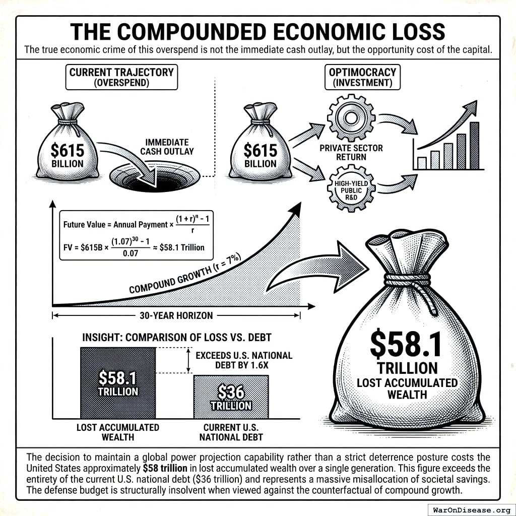 \[\text{FV} = \$615\text{B} \times \frac{(1.07)^{30} - 1}{0.07} \approx \$58.1 \text{ Trillion}\] Insight: The decision to maintain a global power projection capability rather than a strict deterrence posture costs the United States approximately $58 trillion in lost accumulated wealth over a single generation. This figure exceeds the entirety of the current U.S. national debt ($36 trillion)161 and represents a massive misallocation of societal savings. The defense budget is structurally insolvent when viewed against the counterfactual of compound growth.