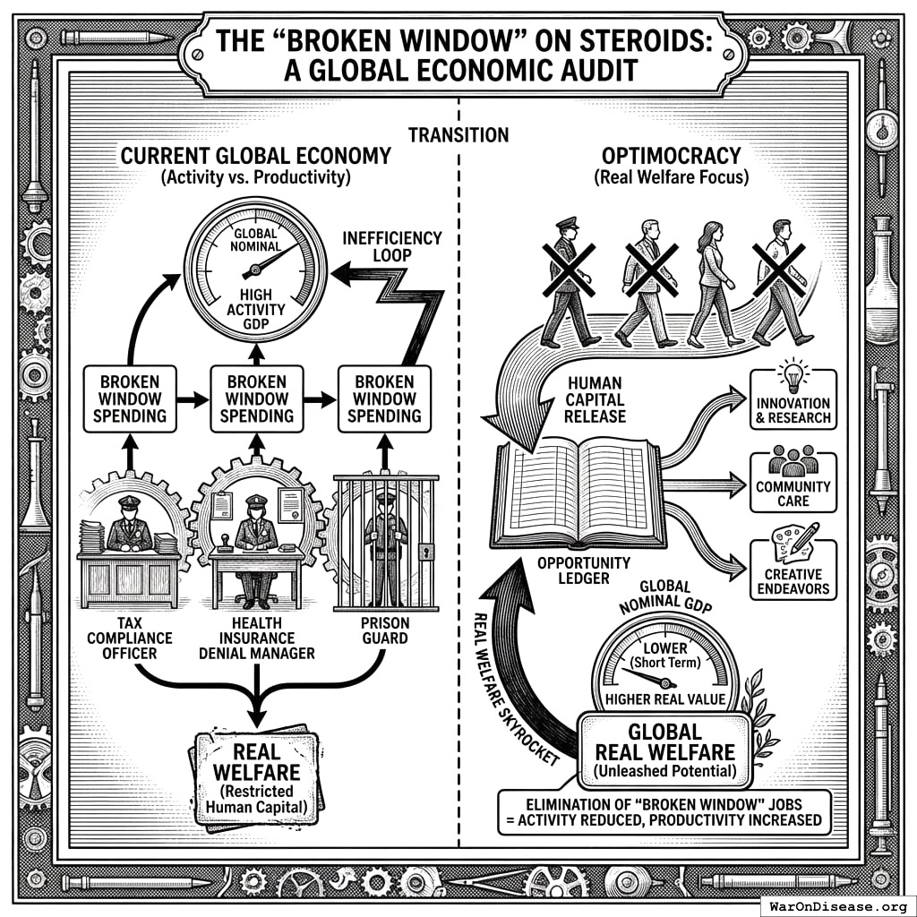 Our central hypothesis posits that current governance operates at less than 10% of its theoretical efficiency. To test this, we contrast the Status Quo against a theoretical maximum denoted as “Optimocracy” (or Optimal Governance). In an Optimocracy, resource allocation is outcome-optimizing: capital flows are determined by their ability to maximize Quality-Adjusted Life Years (QALYs) and long-term economic growth, unencumbered by the principal-agent problems that define contemporary politics. This audit rigorously quantifies two distinct ledgers: the Waste Ledger, tracking the direct incineration of capital through inefficiency; and the Opportunity Ledger, measuring the “buried multipliers” of unrealized scientific and human potential.